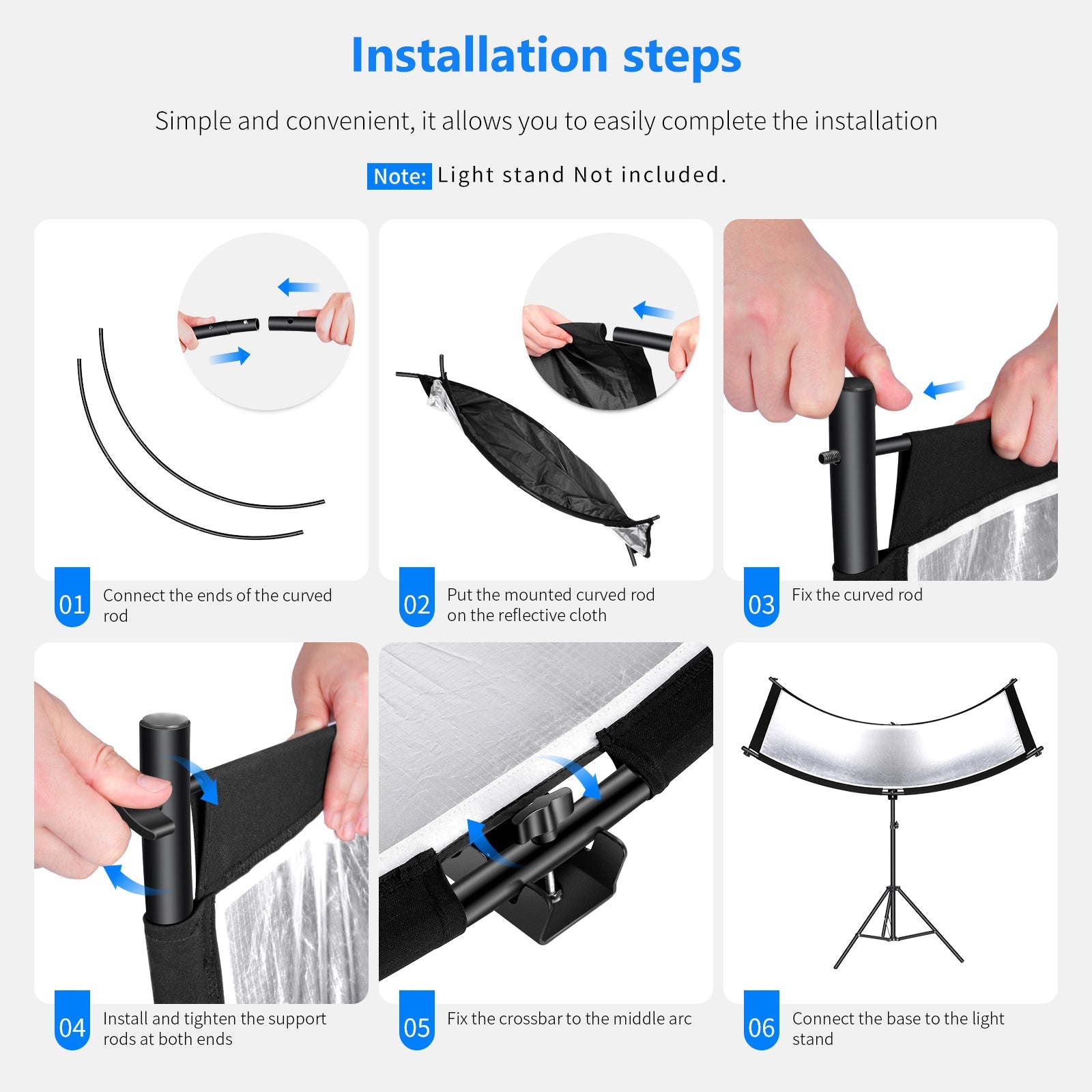 • Tool-Free Assembly- Six interlocking curved tubes, two rugged metal rods, and screw knobs enable you to assemble the frame in minutes without any tool needed. The curved tubes and rods can smoothly slip through the rod pockets and stretch the reflector taut