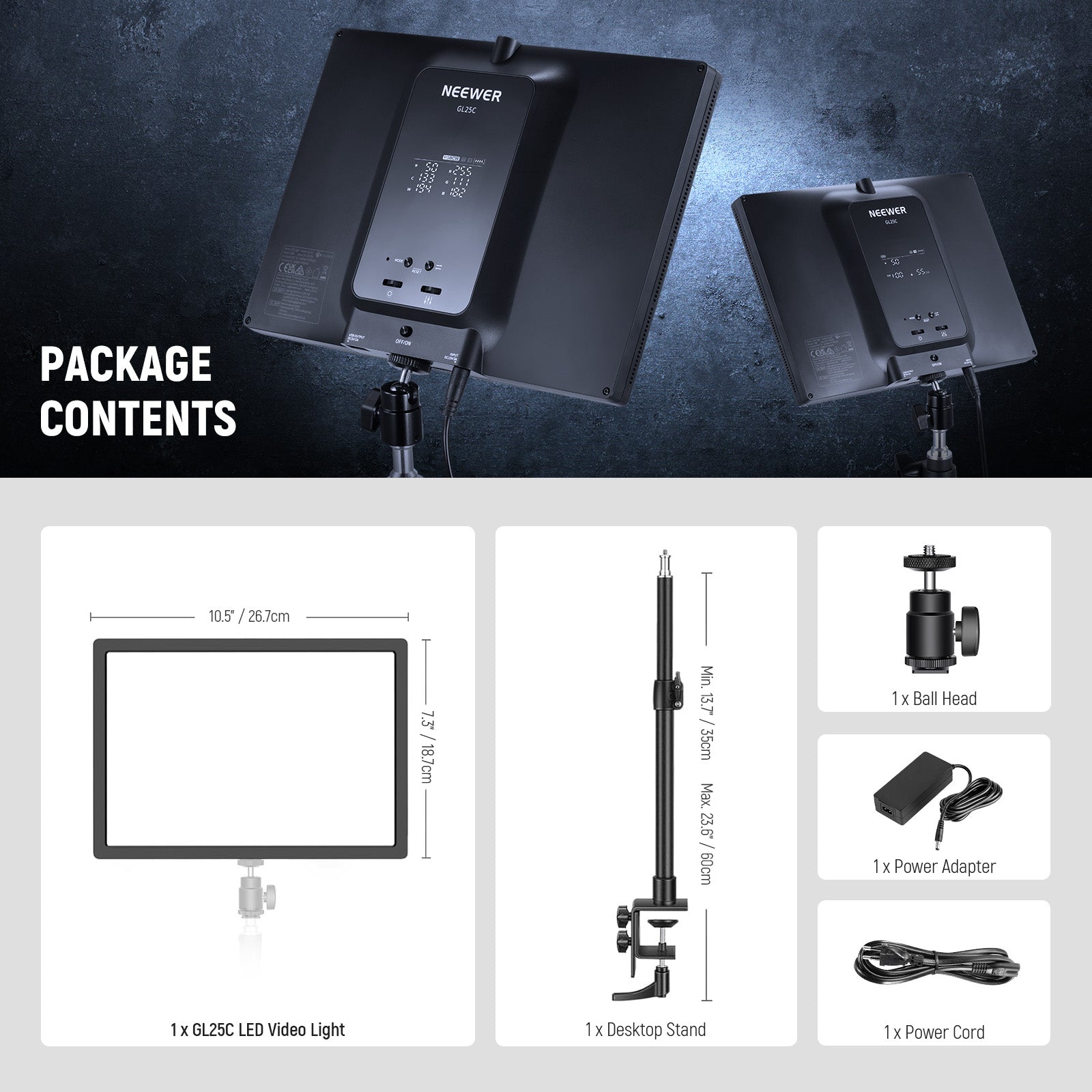 - Extendable Desktop Stand with 360° Ball head- The streaming key/fill light kit includes an adjustable desk/table stand (13.8"-23.6"/35-60cm, with 11lb/5kg load capacity) and a 360° ball head for flexible adjustment of lighting height and angle as required. The stand features a C clamp for quick attachment to any desk of 0.35"-2.95"/0.9-7.5cm thick. The C clamp is rubber padded to secure a firm grip on the desk while preventing scratches