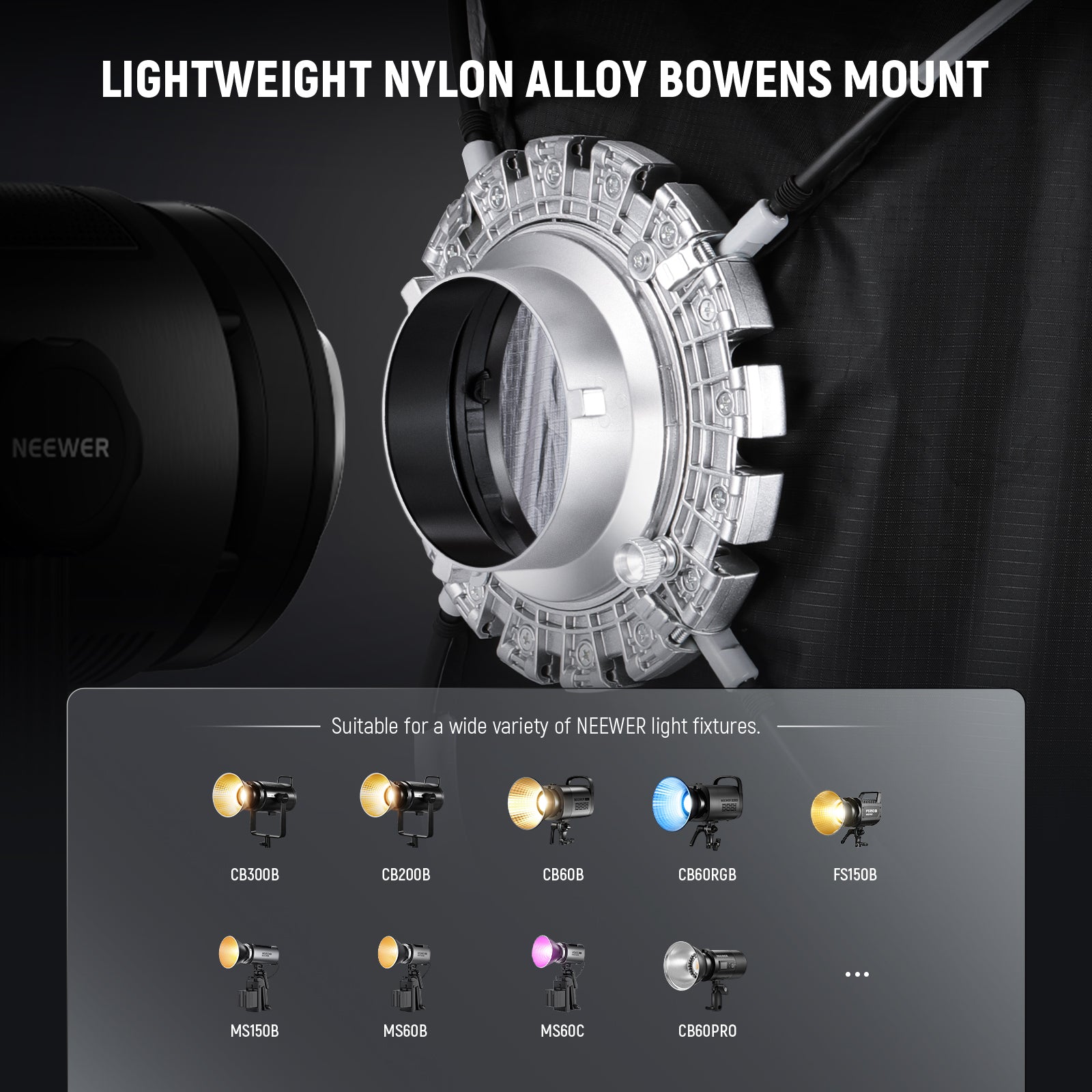 • Attach Via Bowens Mount- This photography softbox diffuser with standard Bowens mount is compatible with various studio lighting equipment, strobe flashes speedlights moonlights, and continuous output COB LED video lights, including NEEWER Vision 4 Q4 CB300B CB200B FS150B CB100C MS150B MS60C MS60B CB60 RGB S101-300W/400W PRO, compatible with Aputure 300c 200X 60D 60x S, compatible with Godox SL60w, compatible with SmallRig RC 120D RC 120B, etc