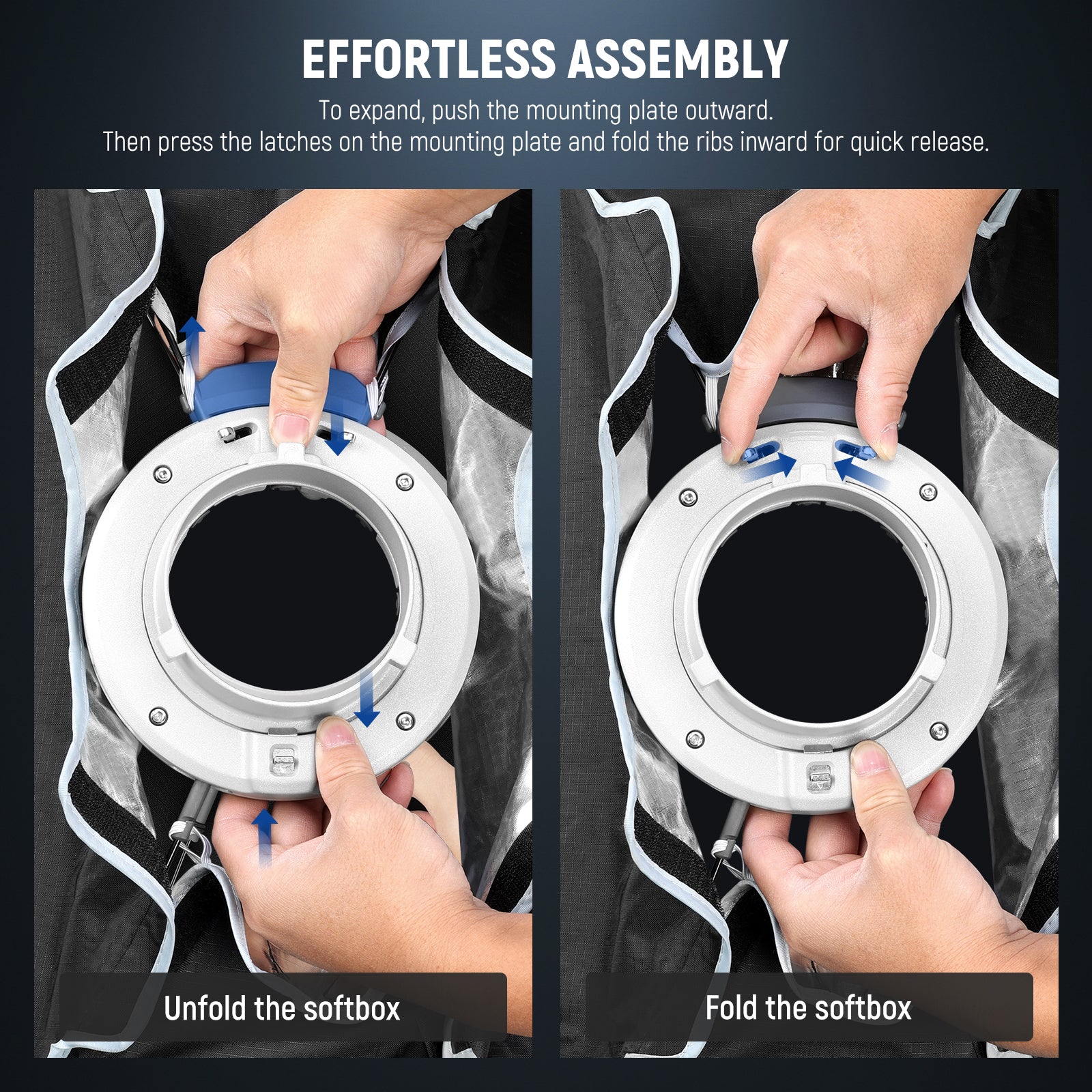 - Effortless Assembly- With just a simple push on the mounting plate, the softbox effortlessly unfolds and locks into place, with the loop and hook fasteners to secure the included diffuser layers and grid, and ready for use. When it's time to pack up, push the latches on the mounting plate and fold the ribs inward for quick release. Four resilient and robust ribs give this softbox incomparable durability that can withstand tens of thousands of presses without deformation for years of use