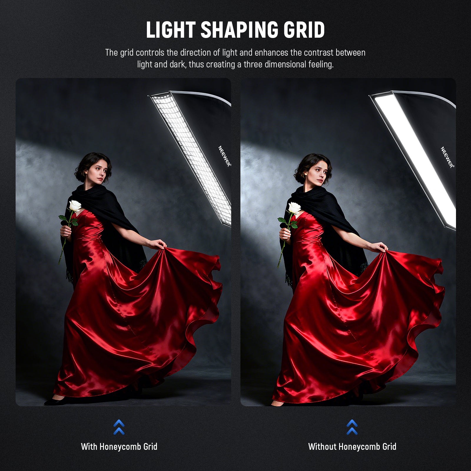 - Customizable Honeycomb Grid & Diffusers- For various shooting scenarios and photography styles—be it portrait, still life, or live streaming, the softbox lighting kit includes a honeycomb grid for more confined and directional light, and two diffusion panels attaching via touch fasteners to soften glare and eliminate shadows