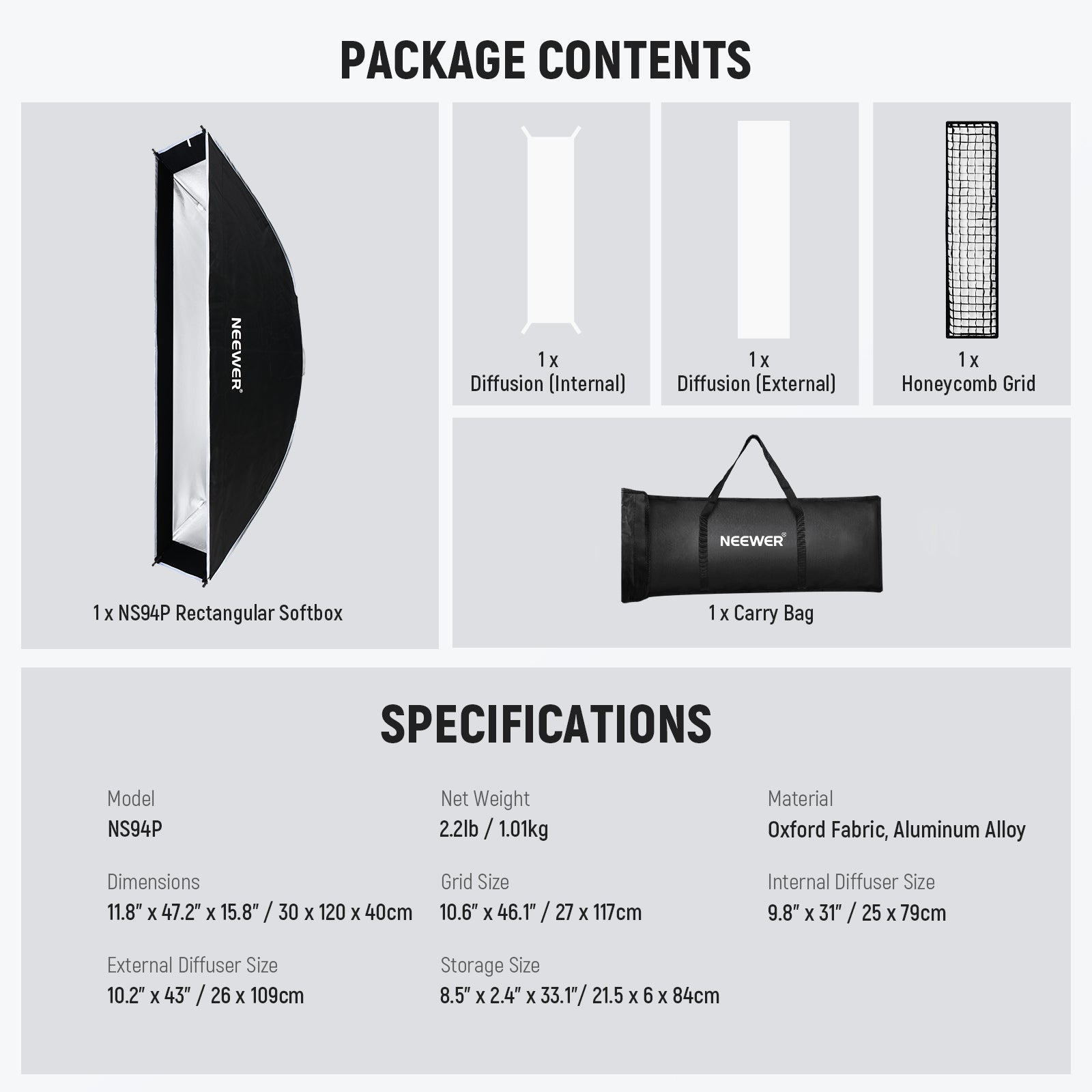 - Portable & Vastly Applicable- Once folded (30.7"x6.3"x2.6"/78x16x6.5cm), the softbox can slide into the carrying bag for portability. Inner mesh pockets provide storage space for the grid. Versatile and practical, this softbox is ideal for portraits, product photography, fashion shoots, and other photography genres