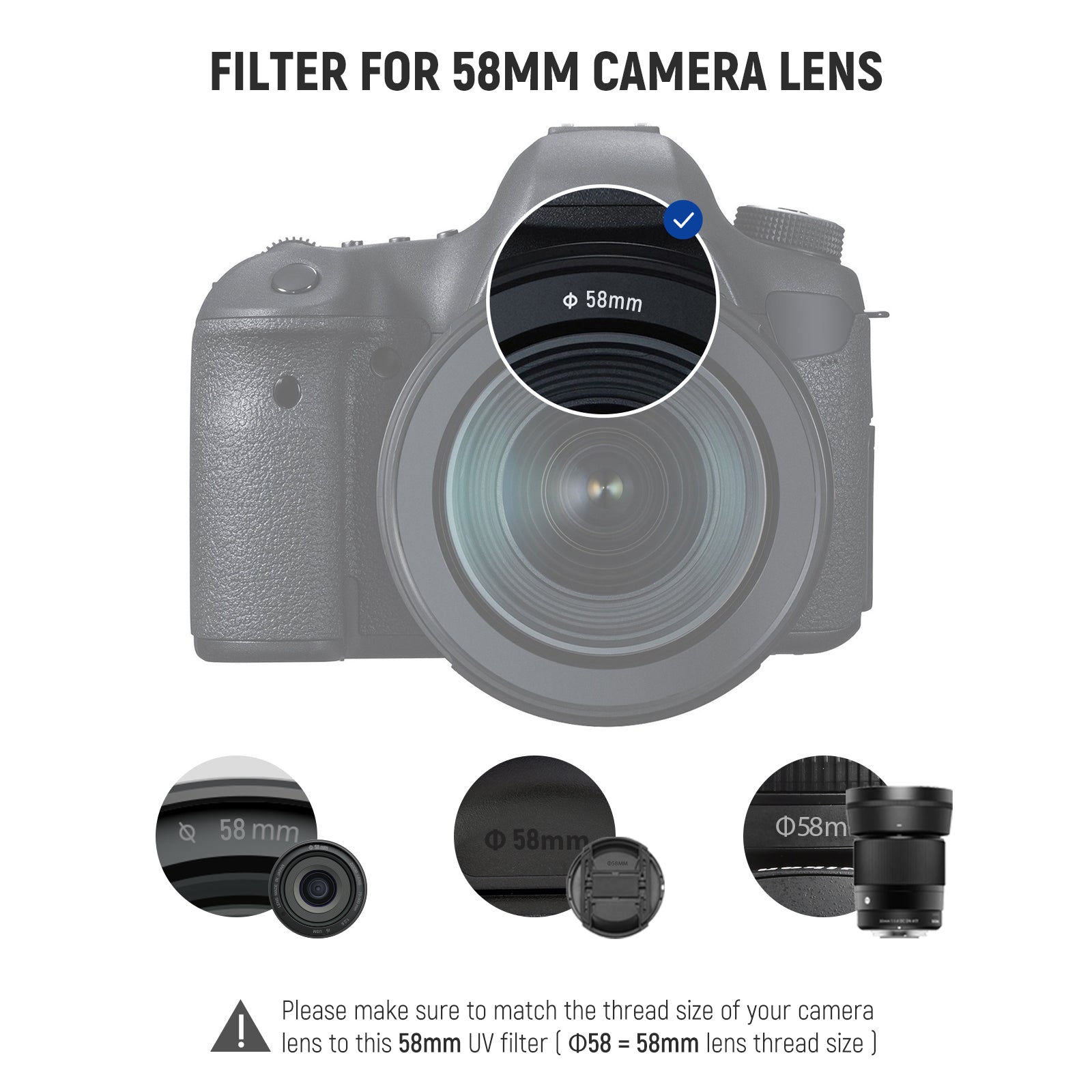 - Choose the Correct Filter Size- This range of HD UV filters comes in different sizes.?For example, the 58mm filter can only work with a 58mm camera lens. Please make sure to match the thread size of your camera lens to the UV filter (Φ58 = 58mm lens thread size). A carrying case is also included to store the filter safely