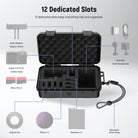 - 12 Dedicated Slots- 12 slots keep everything tidy and organized. 1x slot for Action 5 Pro/4/3 camera body; 1x slot for quick release adapter mount; 2x slot for micro SD cards; 3x slot for batteries; 1x slot for the original lens; 3x slot for filters; 1x slot for assorted small accessories (cables, action camera adapters, fill lights, and others). Compatible with DJI Osmo Action 5 Pro Adventure Combo accessories