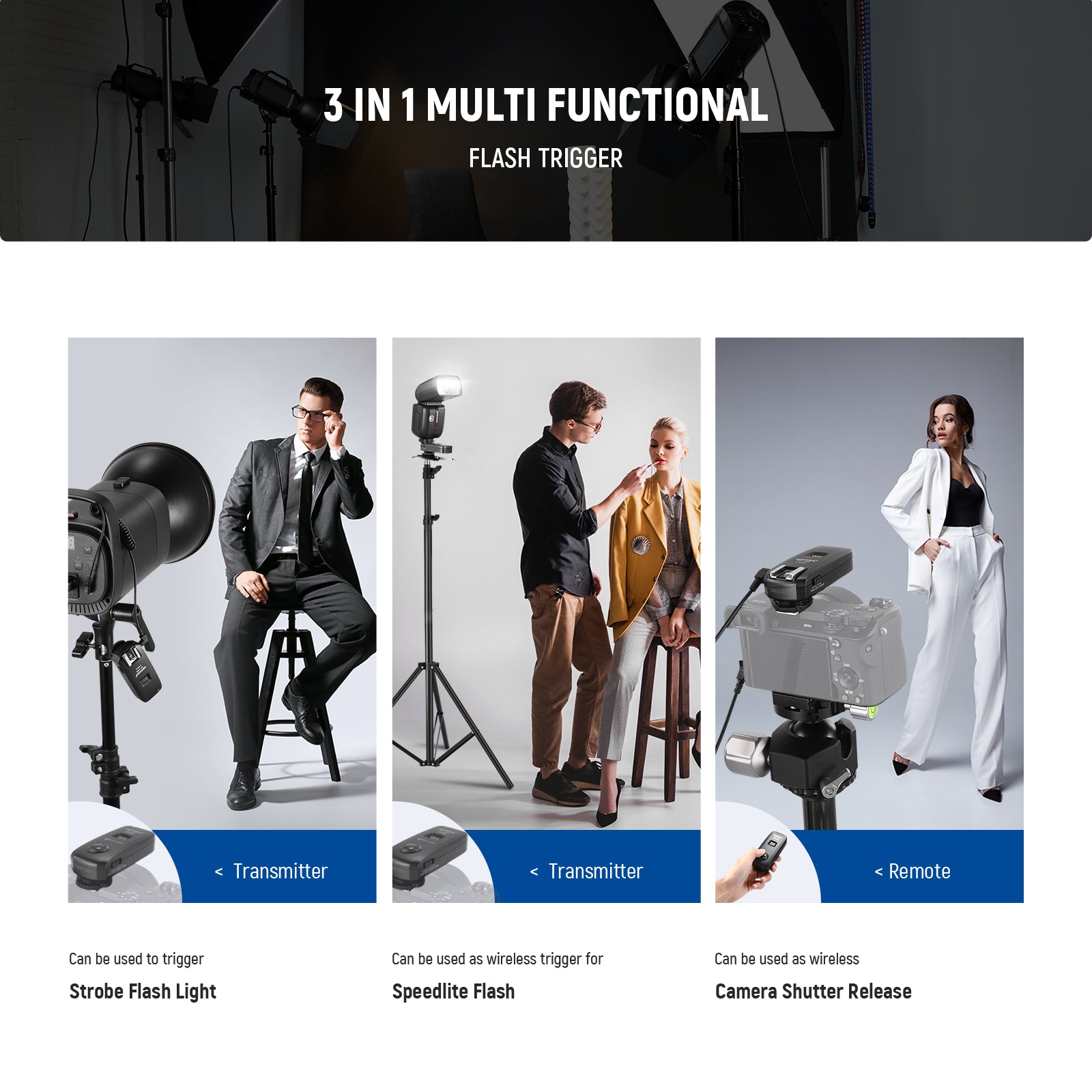 - 3 in 1 Multi Functional Flash Transmitter- This remote flash trigger transmitter can be used as (1) the wireless synchronous trigger studio strobe flash, such as NEEWER S101-300W S101-400W S101-400W PRO Q300 flash; (2) It can be used as wireless trigger speedlite flash; (3) It can also be used as wireless camera shutter release