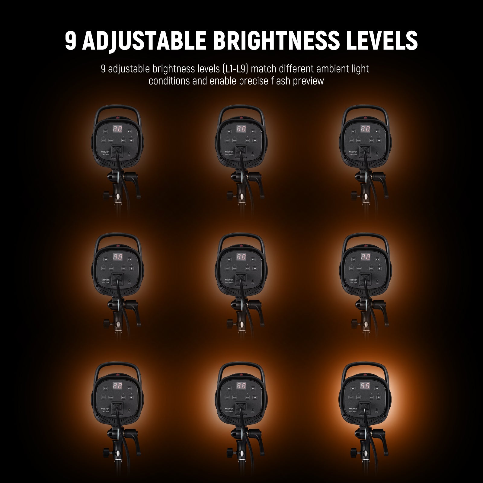 - 9 Adjustable Brightness Levels- 9 adjustable brightness levels (L1-L9) match different ambient light conditions and enable precise flash preview