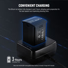 - Charging Time- The li ion battery fully charges in just 3 hours, allowing quick preparation for the next session and maximizing shooting time. Rapid charge for more time capturing shots