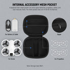 • Internal Accessory Mesh Pocket- A zippered inner mesh pocket can store spare batteries and propellers, cables, and user manuals. Note: The mesh pocket does not fit the NC-R3 Remote