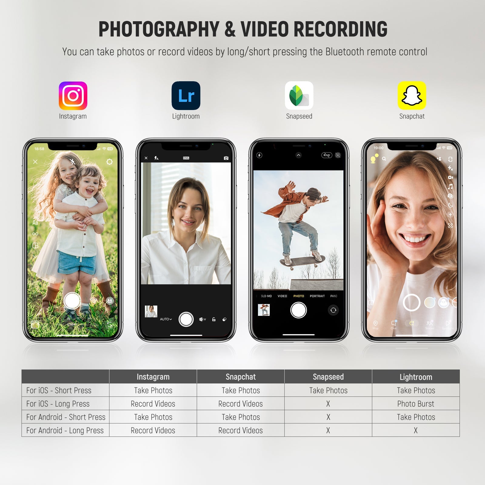 - Take Selfies with 1 Tap- Pair this remote shutter release with your iOS/Android smartphone or tablet via Bluetooth connection for selfies, portraits, YouTube videos, and Zoom calls — all with 1 tap in your palm. Short press for photos, long press for videos