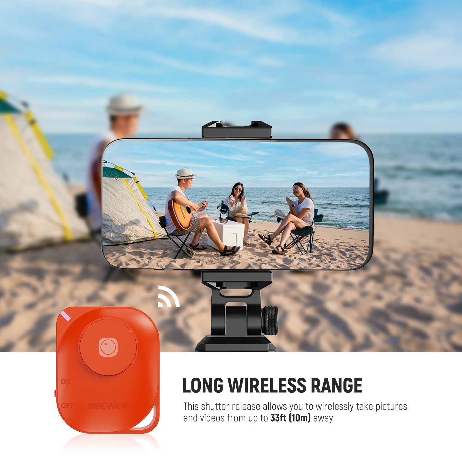- Long Wireless Range- This shutter release allows you to wirelessly take pictures and videos from up to 33ft (10m) away — no need to reach your arm to the phone screen again