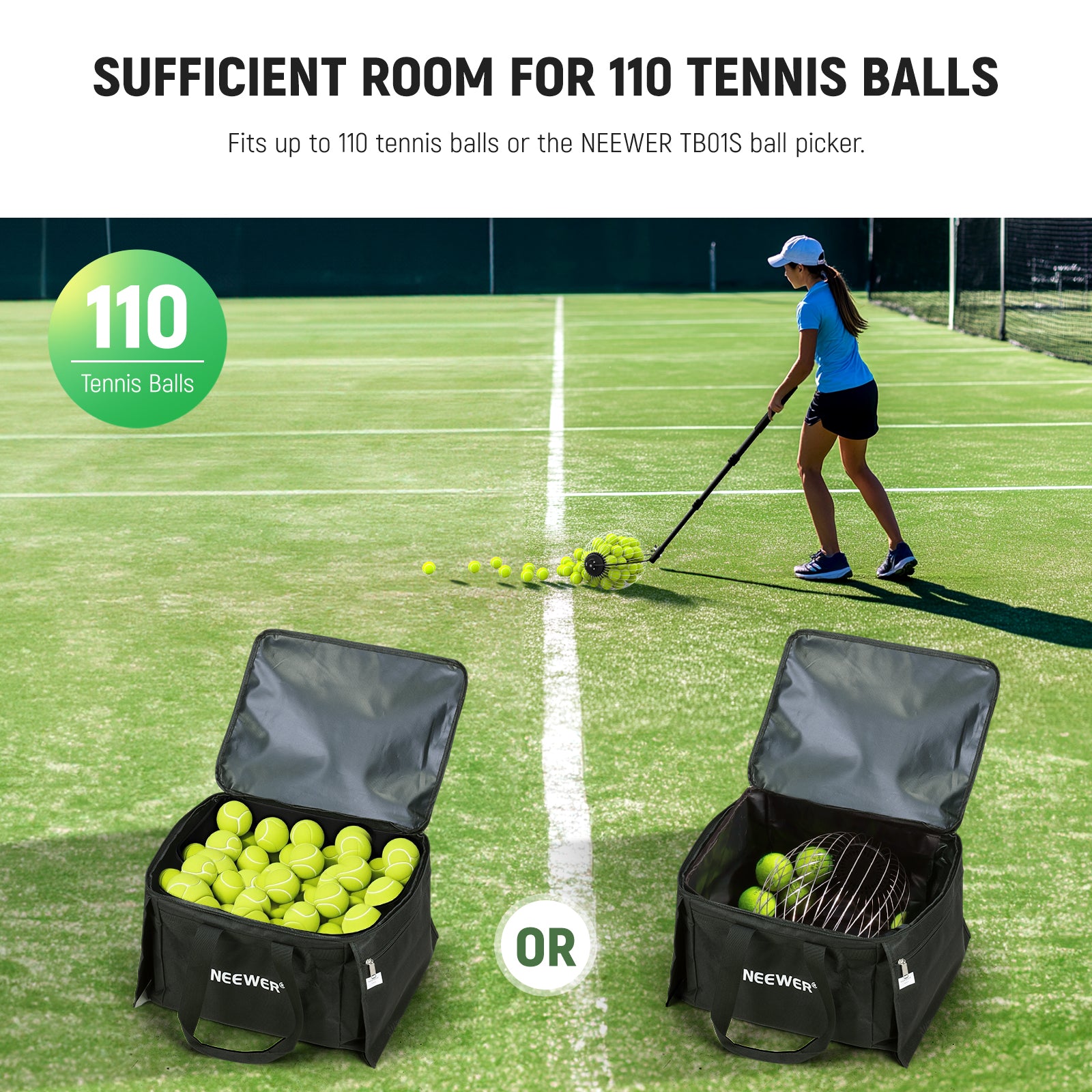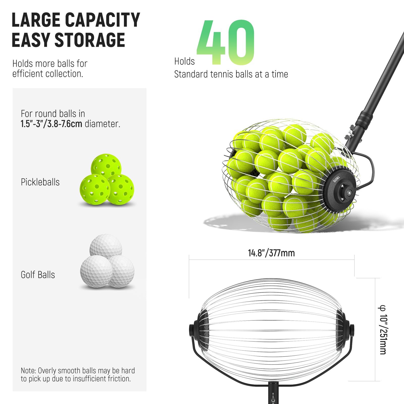- For up to 40 Tennis Balls- Measuring 9.8" x 15" (25 x 38cm), the roller collector with flexible wires offers spacious room for up to 40 standard tennis balls (2.4"-2.7"/60-68mm). To take out the balls, manually spread the wires apart to let them out