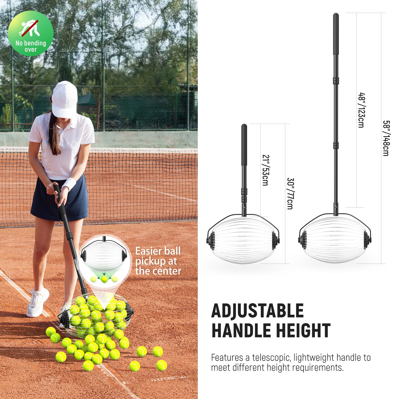 - Adjustable Height for Optimal Comfort- The telescopic handle allows you to adjust the tennis ball collector's height between 30"-58"/77-148cm to accommodate users of different heights, with the end covered in soft, nonslip foam for a comfortable grip. It ensures a pleasant experience for everyone, saving time and avoiding unwanted hassle, so you can focus more on your practice