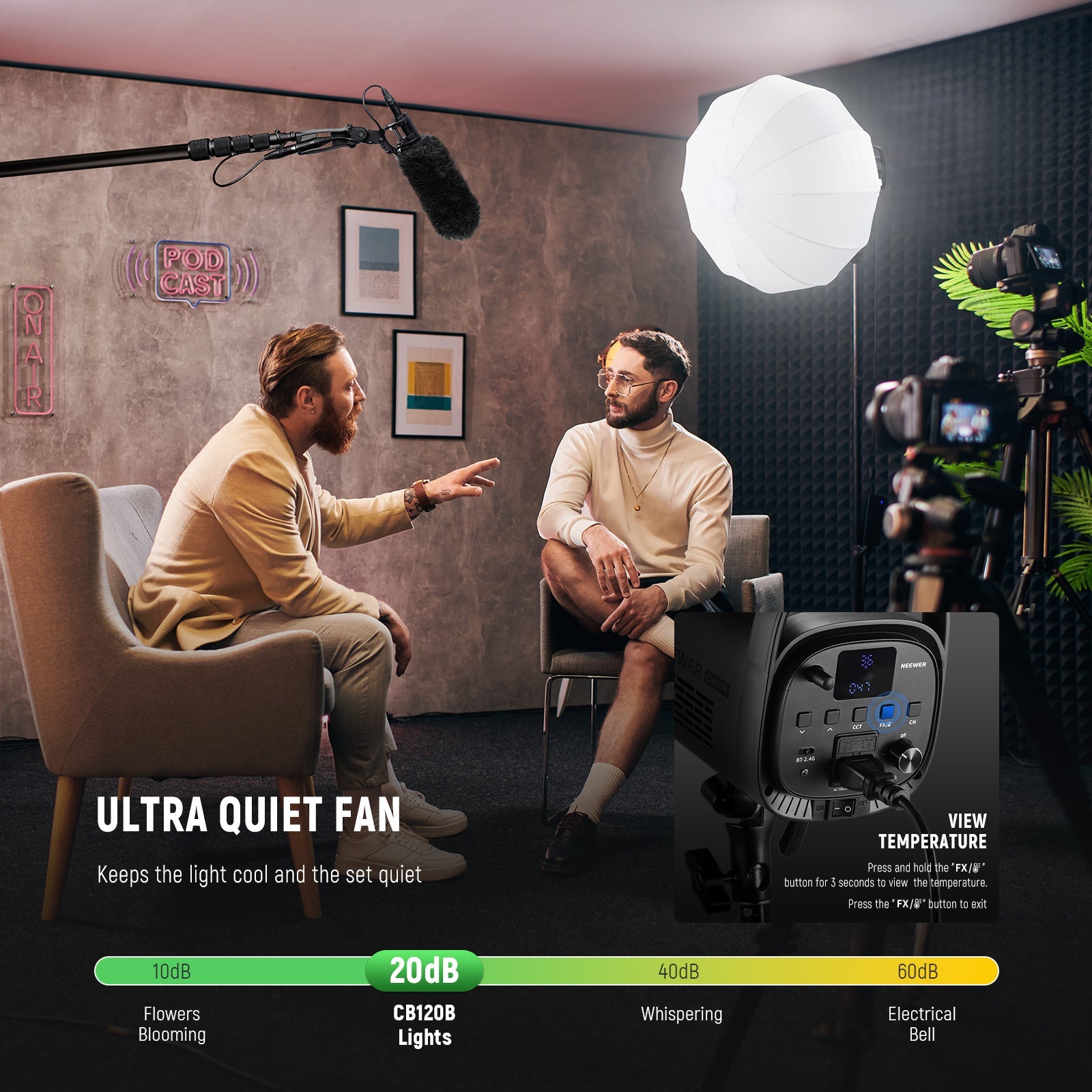 - Efficient & Silent Heat Dissipation- Radial heatsinks ensure even heat dissipation. The smart fan runs slowly when the light is on, and then accelerates to enhance air ventilation after the light reaches a certain temperature. In addition to extending the light's longevity, the silent fan also provides a quiet environment for video recording