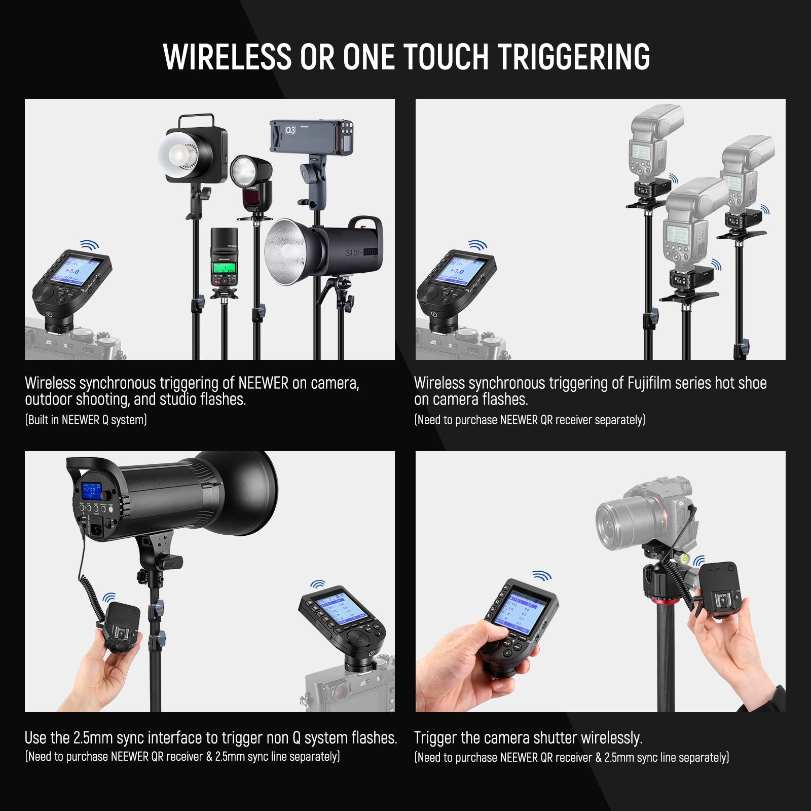 • Built In 2.4G Wireless Q System- Wirelessly trigger NEEWER Q4 Q3 Z2-C Z1-C Z760-C NW420-C NW655-C NW665-C S101-300W PRO, S101-400W PRO thanks to the built in NEEWER wireless Q system, or control other flashes without a Q system using a NEEWER QR receiver and a 2.5mm sync cord (all sold separately).