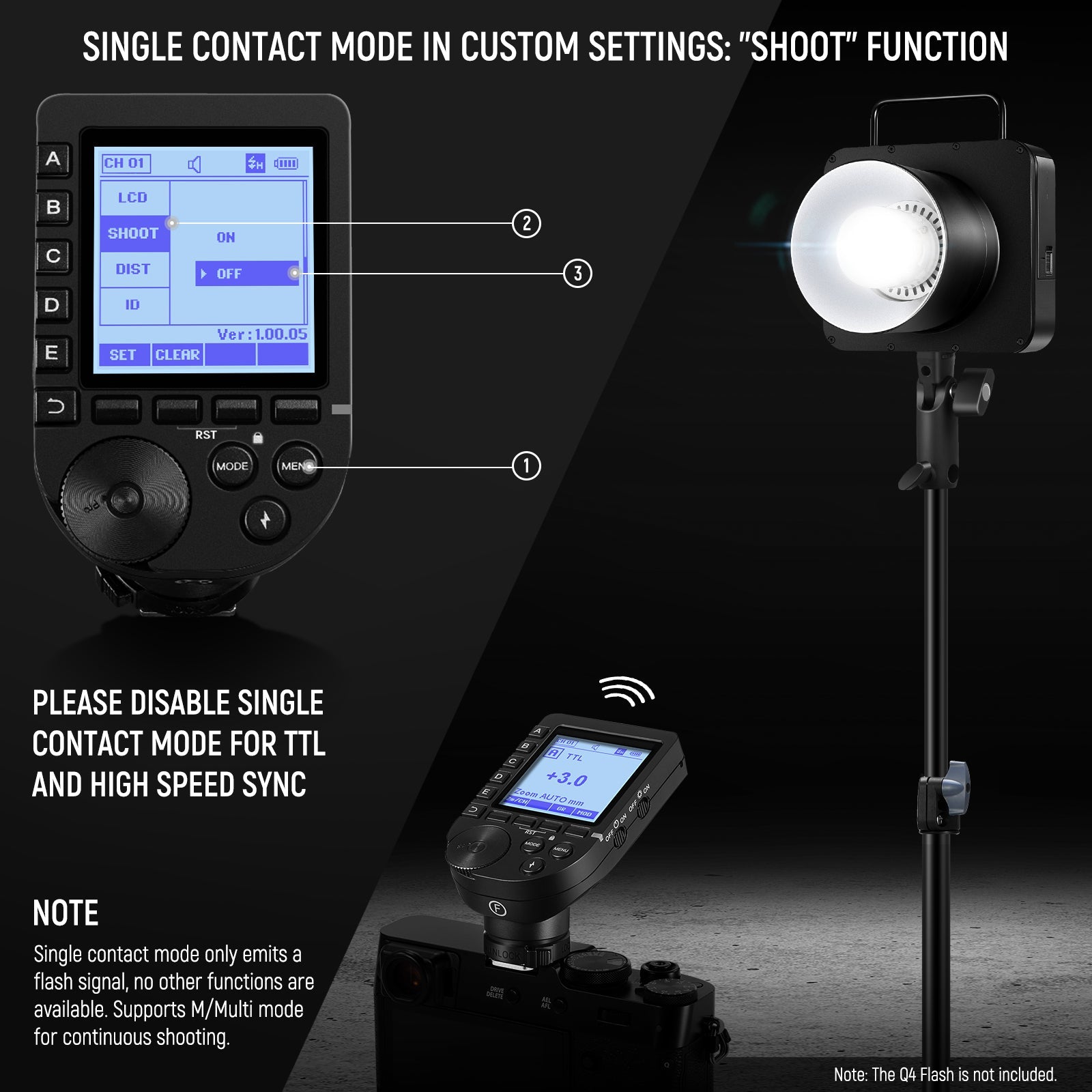 • Versatile Professional Flash Trigger- This QPRO-C wireless flash trigger is powerful and supports a wide range of functions, including TTL, 1/8000s high-speed sync, multi-flash, manual flash, flash exposure compensation (FEC), magnification function, group modeling lamp control, group zooming, Single-point triggering and more. You can also adjust the output values of all groups at the same time.Note: Please disable single contact mode ''SHOOT'' for TTL and High Speed Sync.