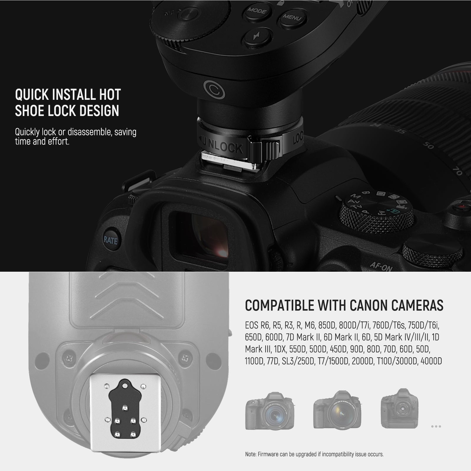• Wide Compatibility- The QPRO-C flash trigger can be quickly fixed on the camera with the metal hotshoe. Compatible with Canon EOS R6, R5, R3, R, M6, 850D, 800D/T7i, 760D/T6s, 750D/T6i, 650D, 600D, 7D Mark II, , 6D Mark II, 6D, 5D Mark IV/III/II, 1D Mark III, 1DX, 550D, 500D, 450D, 90D, 80D, 70D, 60D, 50D, 1100D, 77D, SL3, T7/1500D, 2000D, T100/3000D, 4000D (NOT compatible with RP R50) . Note: Firmware upgrades are available to address compatibility issues. ?