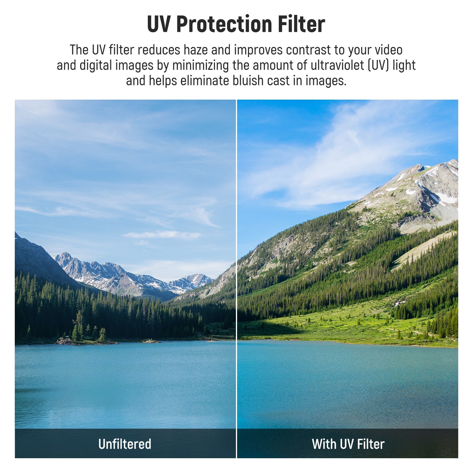 - Protective UV Filter- This UV filter reduces haze and minimizes ultraviolet (UV) rays while improving contrast. Perfect for capturing high altitude and snow photos without the bluish cast. Keep this filter on your lens to protect against dust, scratches, and bumps