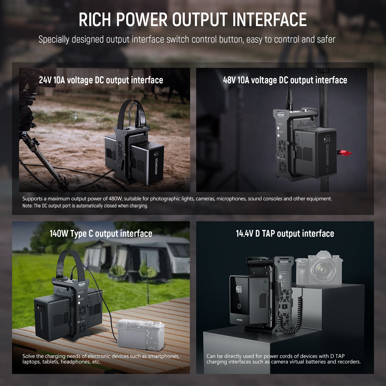 - Multiple Outputs- With DC 48V, DC 24V, 14.4V D-TAP, and 100W Type C ports, it continuously powers LED video lights, studio flashes, camcorders, phones, etc. The DC ports have an independent control switch to reduce power loss. When the device power exceeds 200W, 2 V mount batteries of over 100Wh are required for power supply. Note: To power devices, 2 V mount batteries of identical capacity are critical, and the voltage of the connected device must match that of the corresponding output port