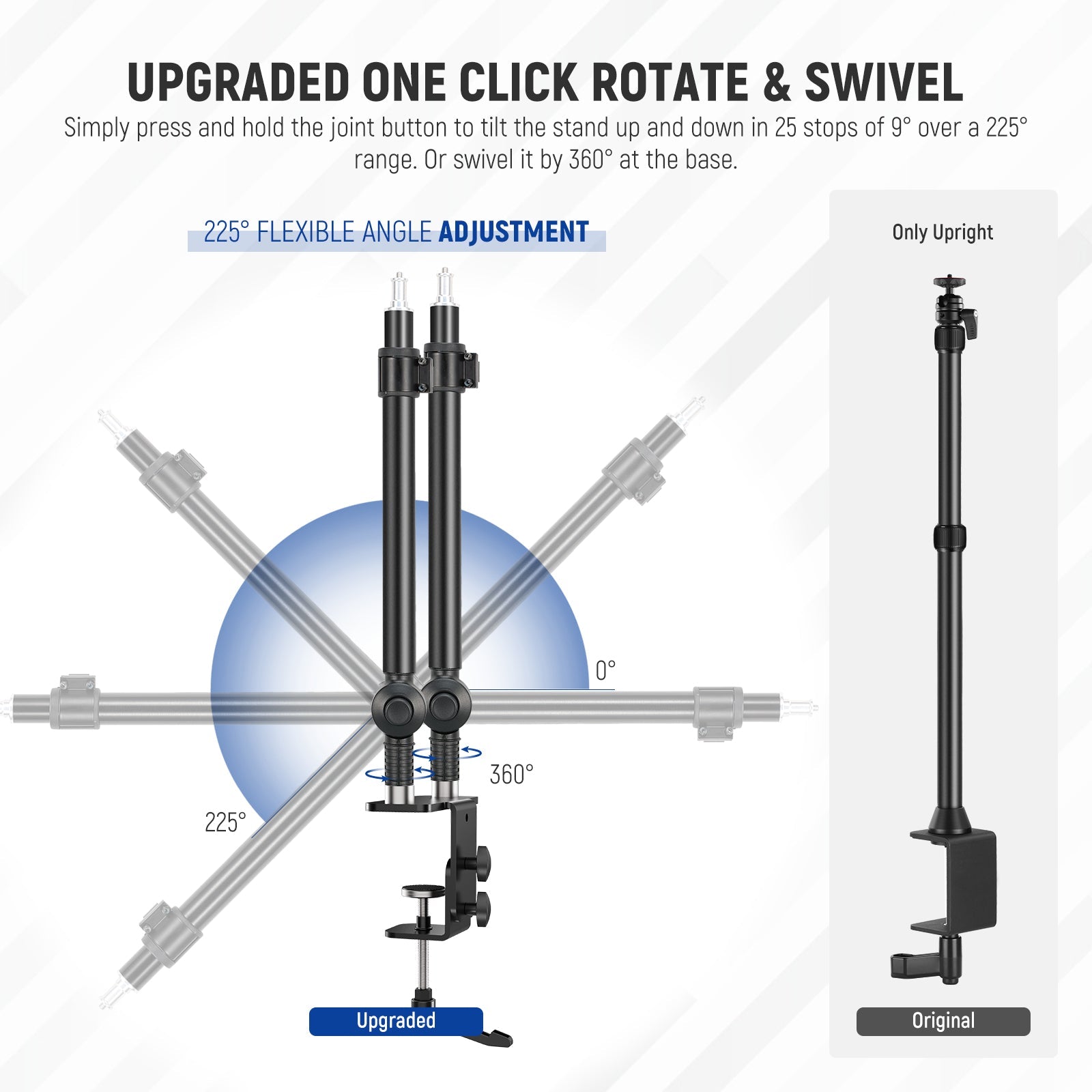 • Upgraded One Click Rotate & Swivel- Press and hold the joint button to tilt the stand up and down in 25 stops of 9° over a 225° range. 360° swivel at the base, and freely meets all the needs of support angles. Even can bend over horizontally on the desk to save space and keep it out of the way when not in usage. Includes 6 cable ties for effective cable management