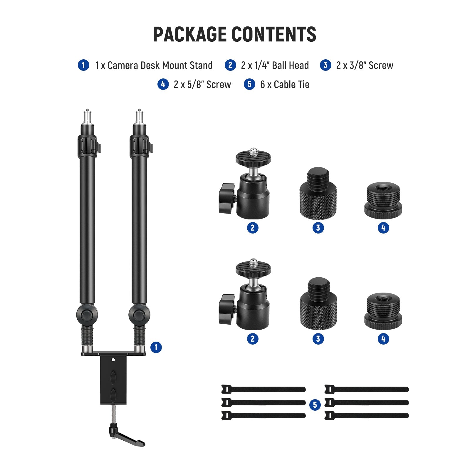 • Space Saving Dual Camera Desk Mount- The upgraded desk C clamp simultaneously mounts two camera stands for desk via two 5/8" studs, saving installation effort and valuable desk space. Fits desks up to 95mm/3.74" thick, with anti slip pads to protect the table. The bottom tightening screw features a handle design for easy and secure locking on the table