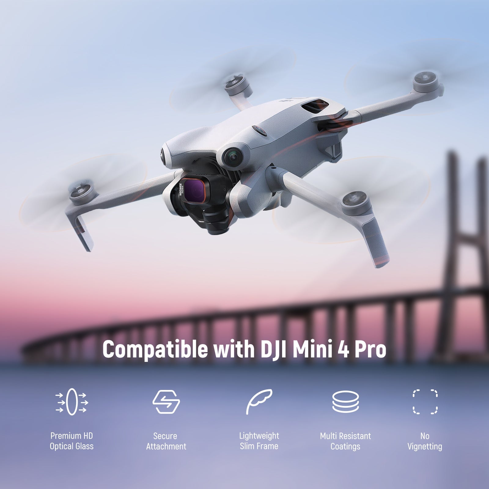 - Dedicated to Mini 4 Pro- Introducing the latest must-have ND & CPL filter set, compatible with DJI Mini 4 Pro.?This NEEWER filter kit boasts top?notch HD glass?that ensure crystal?clear imaging during aerial shooting.?It's a game changer for drone enthusiasts looking to optimize shutter speeds, minimize glare, enrich colors, and achieve impeccable exposure in varying weather conditions