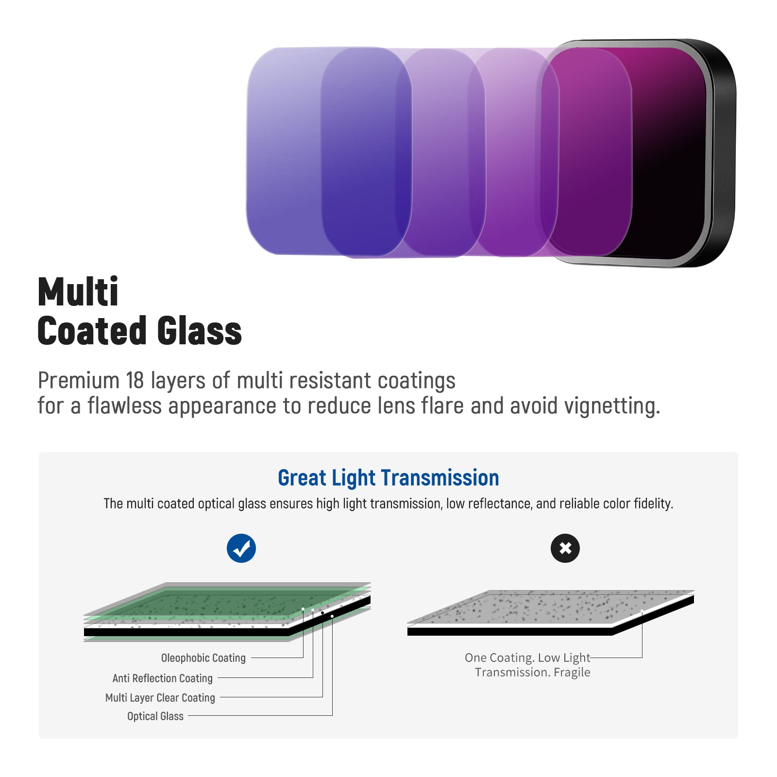 - MULTI COATED HD OPTICAL GLASS- Made of HD optical glass, a good level of transmittance, crystal clear glass for high definition video; Features water proof, oil proof, and scratch proof, reduces fingerprints fog. It also ensures low refractive index/outstanding color neutrality/perfect target transmission