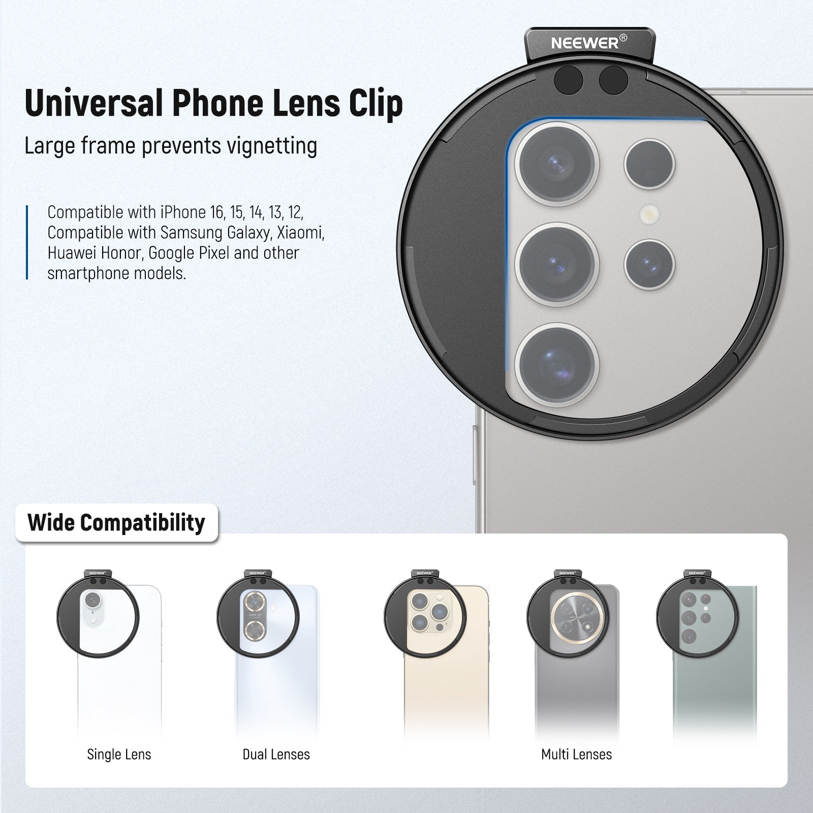 - Universal Phone Lens Clip- Securely attaches to most smartphones with rubber pads to protect against scratches. Compatible with iPhone 16, 16 Pro, 16 Pro Max, 16 Pro Max Plus, 15, 15 Pro, 15 Pro Max, 15 Pro Max Plus, 14, 13, 13 mini, 12, Samsung Galaxy S25 Ultra, S24 Ultra, S23, S22, and other smartphone models