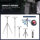 - PRACTICAL AND ADJUSTABLE: This portable tripod for iPhone and camera can be folded to 19 inches compact storage size and 3.53 pounds net weight for easy carrying with bag; 3 levels of opening angle to stabilize on varying uneven grounds and incline levels; The inverted centre column can realize macro photography