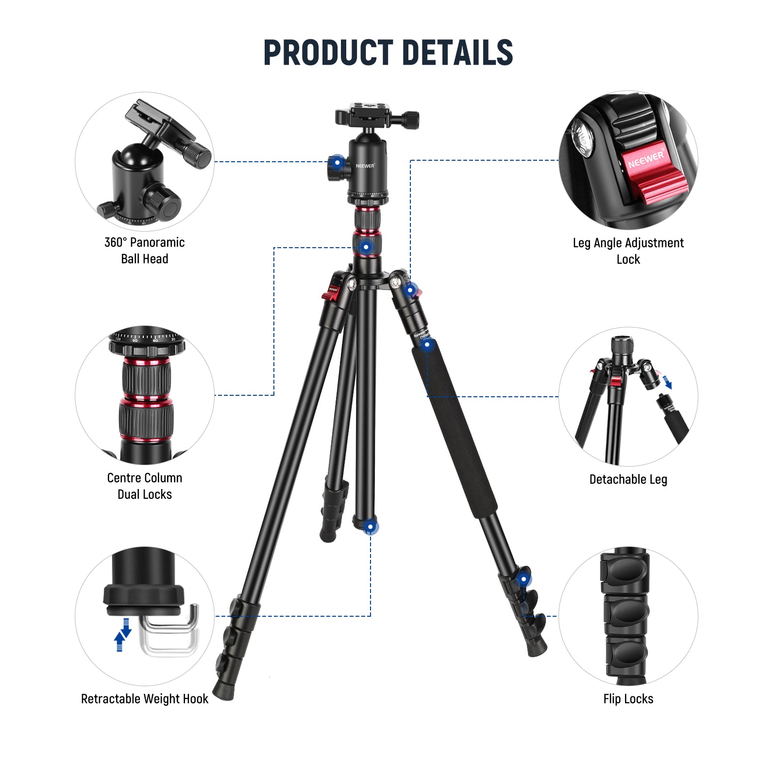 - TRANSFORM INTO MONOPOD: One of the tripod leg tube can be quickly disassembled and connect with the central axis to transform into a monopod, providing an alternative way of shooting with ease; The height of the monopod is adjustable from 35" to 70"