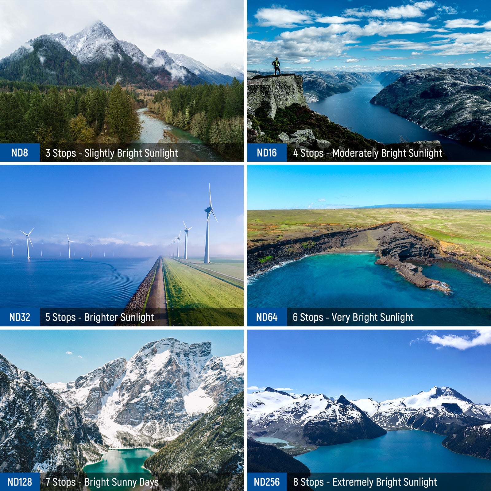 - Balanced Exposure for Superior Outdoor Shots- The ND8, ND16, ND32, ND64 ND128 and ND256 action camera filters, featuring light reduction ranging from 3 to 8 stops, provide precise exposure control during dynamic outdoor activities. They effectively prevent overexposure and elevate image quality across a range of sunlight conditions