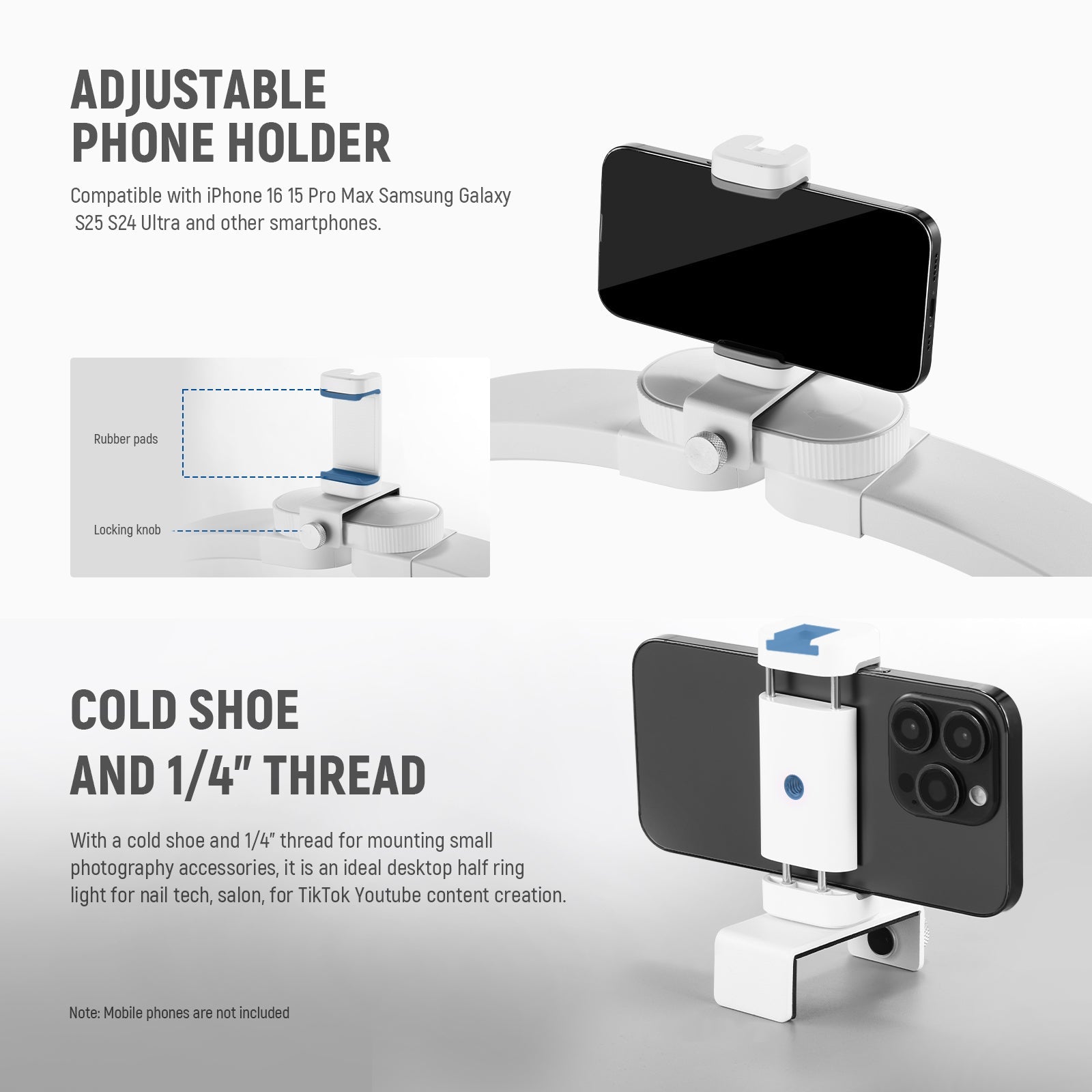 - Adjustable Phone Holder- The cell phone mount of the portable LED half circle desk ring light is compatible with iPhone 16 15 Pro Max Samsung Galaxy S25 S24 Ultra, etc. Easily attached via a locking knob, it is rotatable and adjusts along the lamp edge for versatile shooting angles. With cold shoe & 1/4" thread for small photography videography accessories, ideal as desktop half ringlight lighting for nail tech selfies, pictures, video recording, filming for YouTube TikTok social media sharing