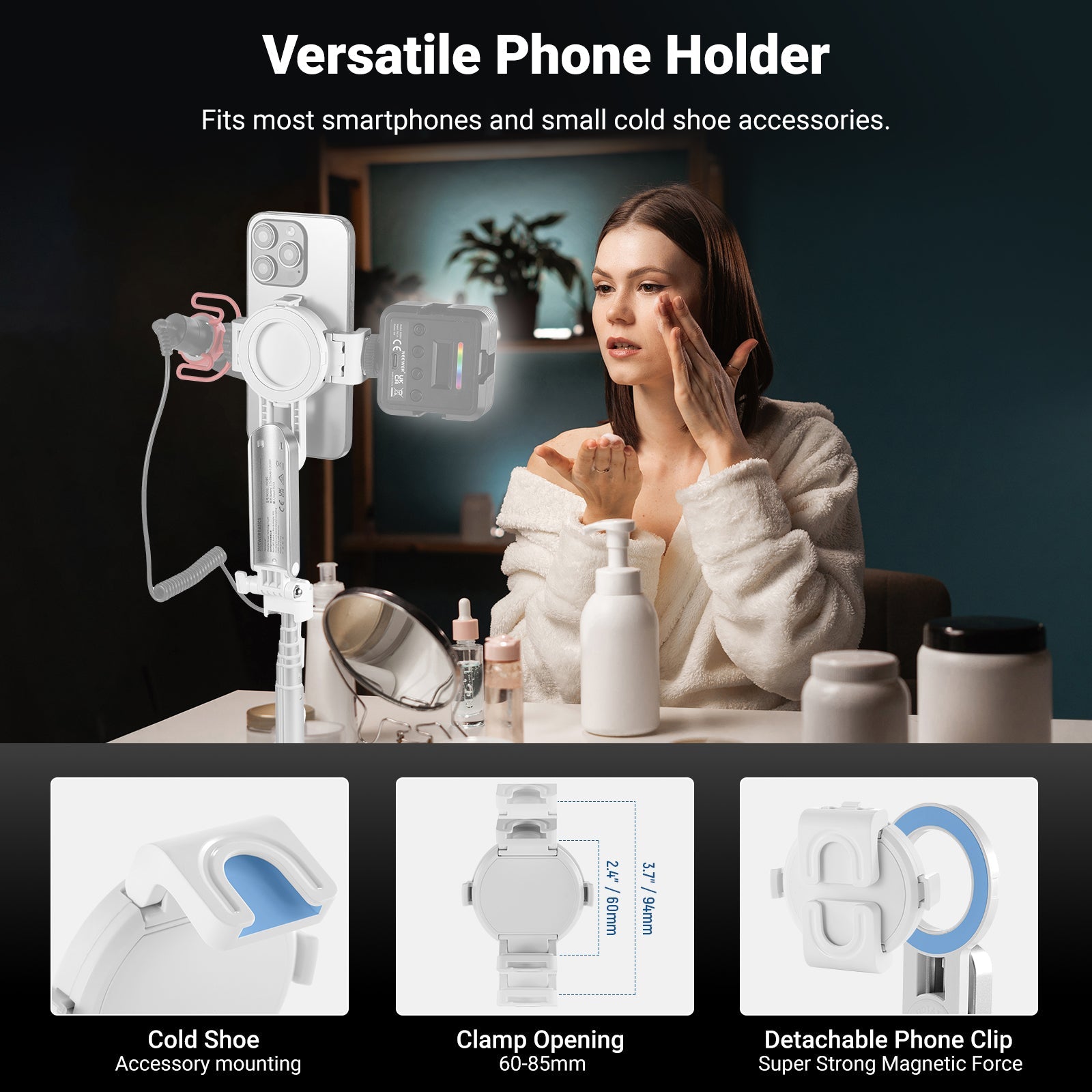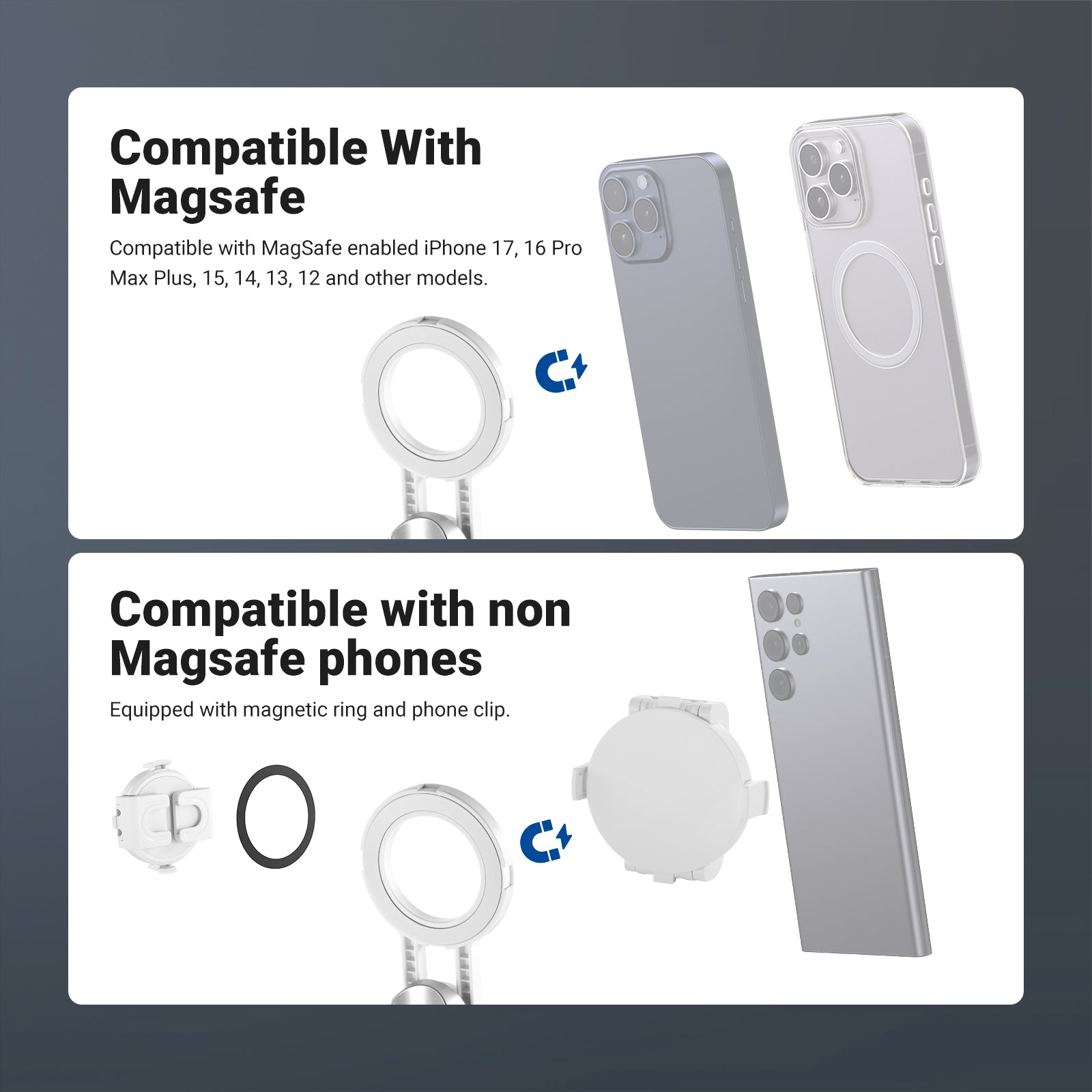 • 360° Universal Phone Holder- With a 2.4"-3.3"/60-85mm opening range, the phone clamp is compatible with iPhone 16 Pro Max iPhone 15 Pro Max Samsung Galaxy S24 Ultra and other smartphones. The 360° rotation allows for vertical and horizontal shooting, while the 225° tilt offers variable camera angles
