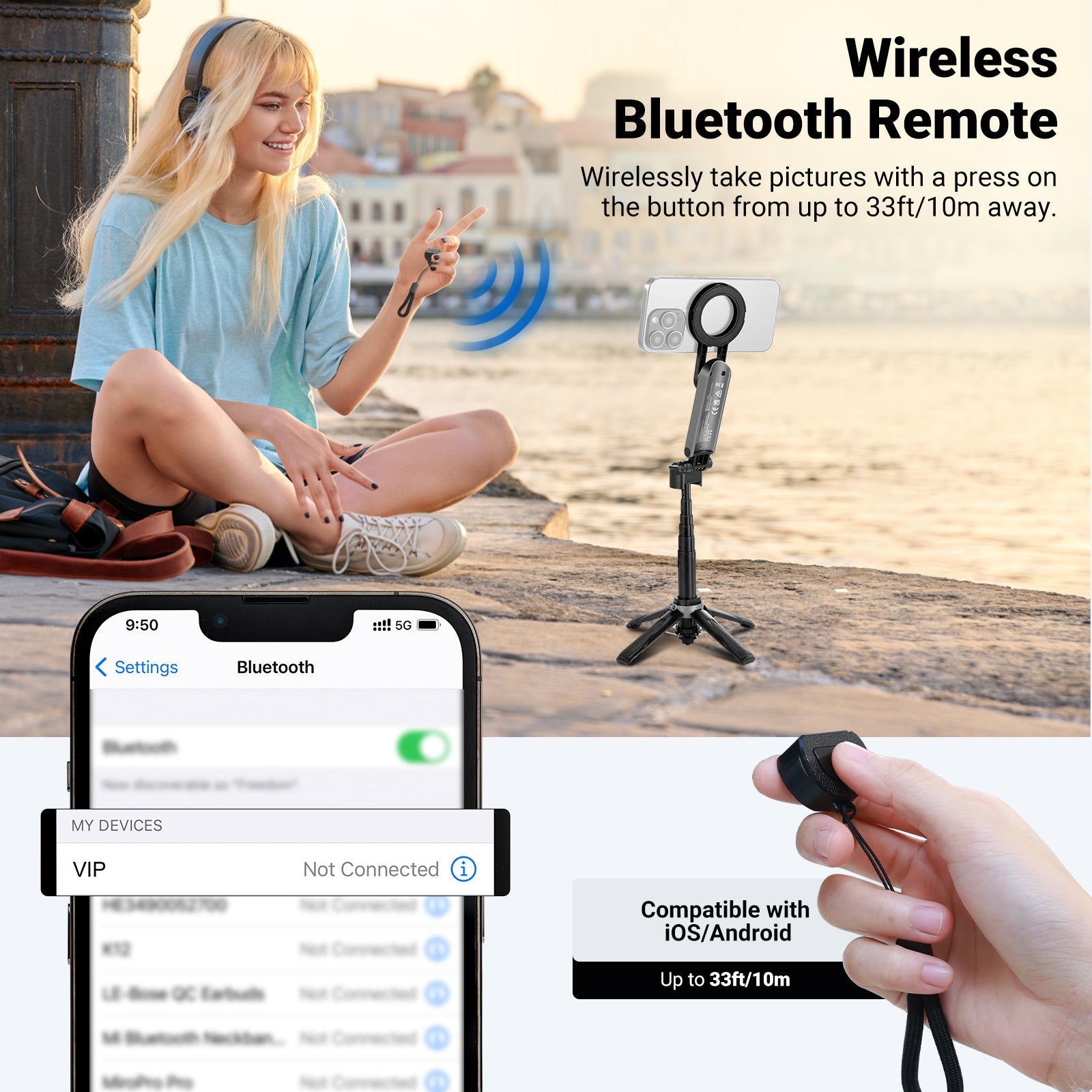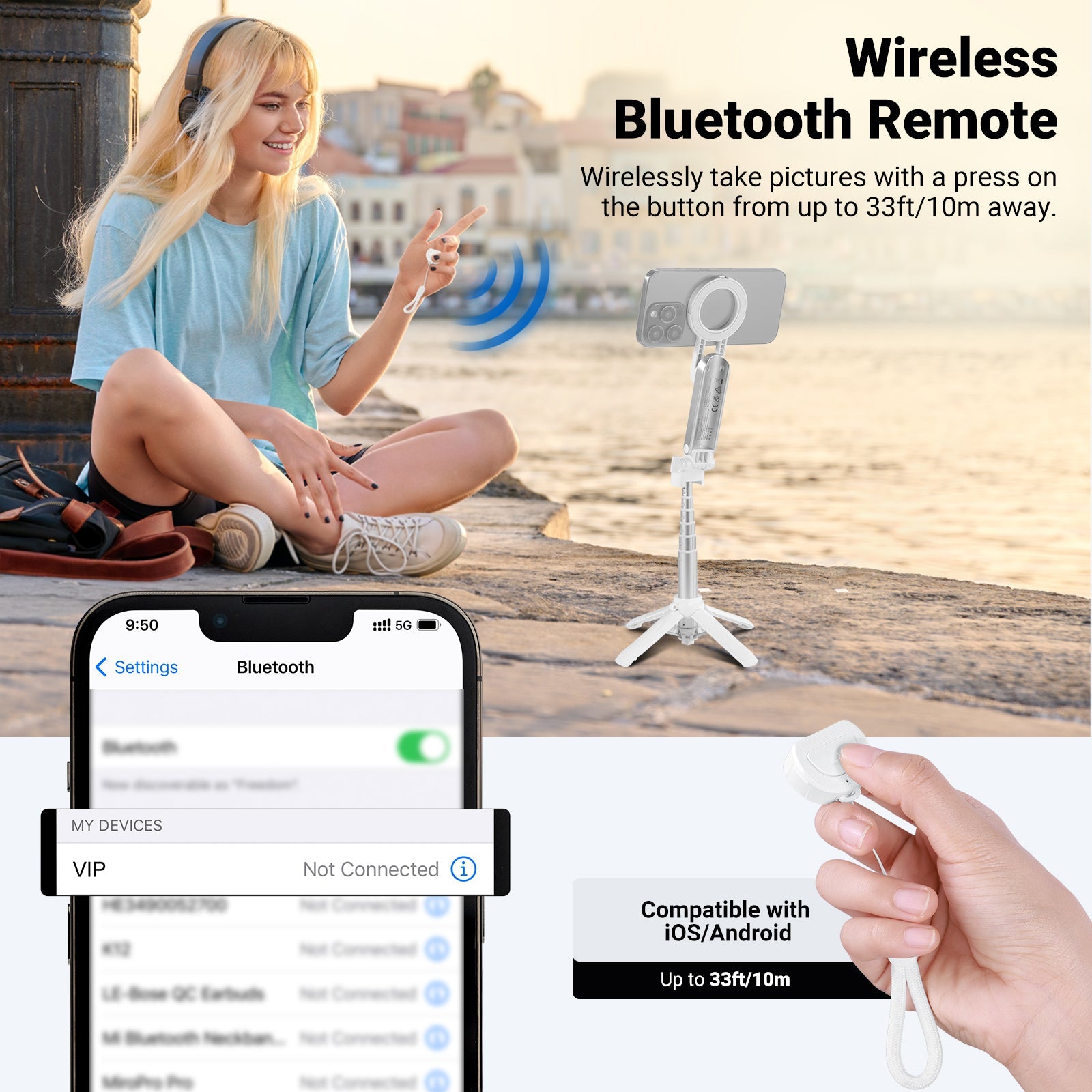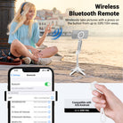 • Bluetooth Remote Shutter- Pair with your phone via Bluetooth and wirelessly capture photos and videos in a range of 33ft/10m. The detachable remote shutter release unit of this phone tripod enables handheld use
