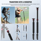 - 2 Axis Flexible Center Column- 1. The unique design of the center column consisting of 2 sections enables the maximum height of the tripod and monopod to be higher; 2. The center axis can be inverted for macro photography, or completely detached for low angle shooting; 3. Combine the center column and the legs as a regular camera tripod, and reverse the legs when stored. Includes a handy hook to hang sandbags (not included) for increased stability