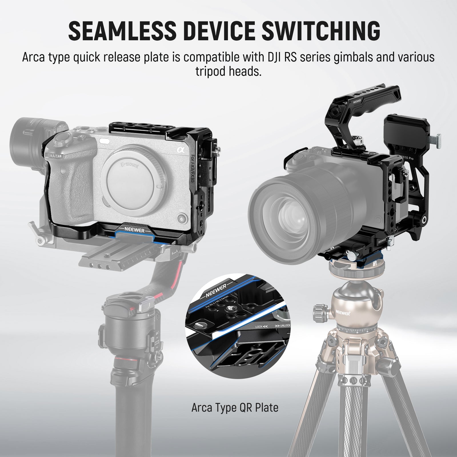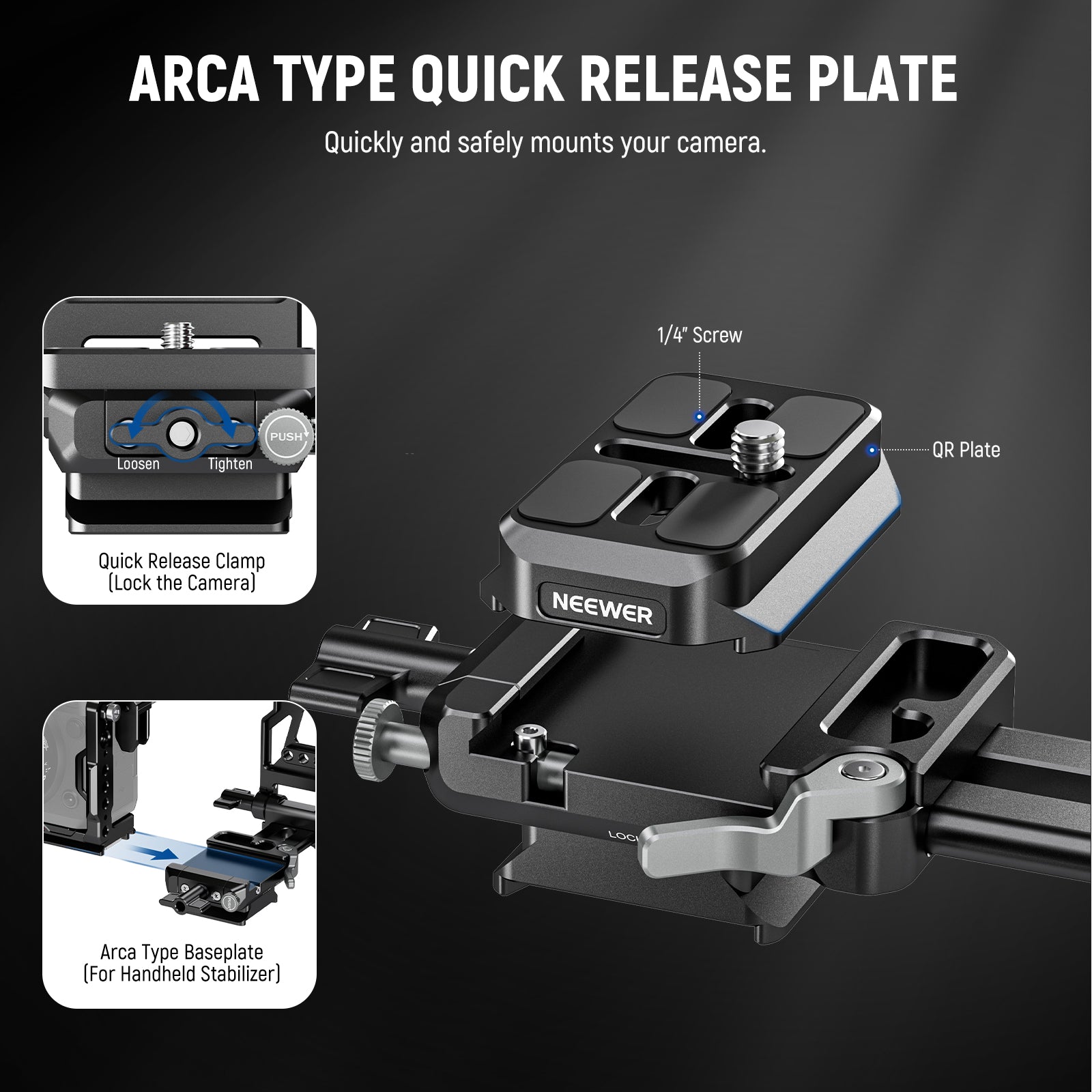 - For RS4/RS3/RS2 Gimbals- Built with an Arca type quick release base, the professional camera cage is compatible with DJI RS 4, RS 4 Pro, RS 3, RS 3 Pro, RS 2, RSC 2 stabilizer gimbals, along with a great variety of tripods—enabling seamless transition between the two equipment types for filming, videography, photography, video recording, and filmmaking