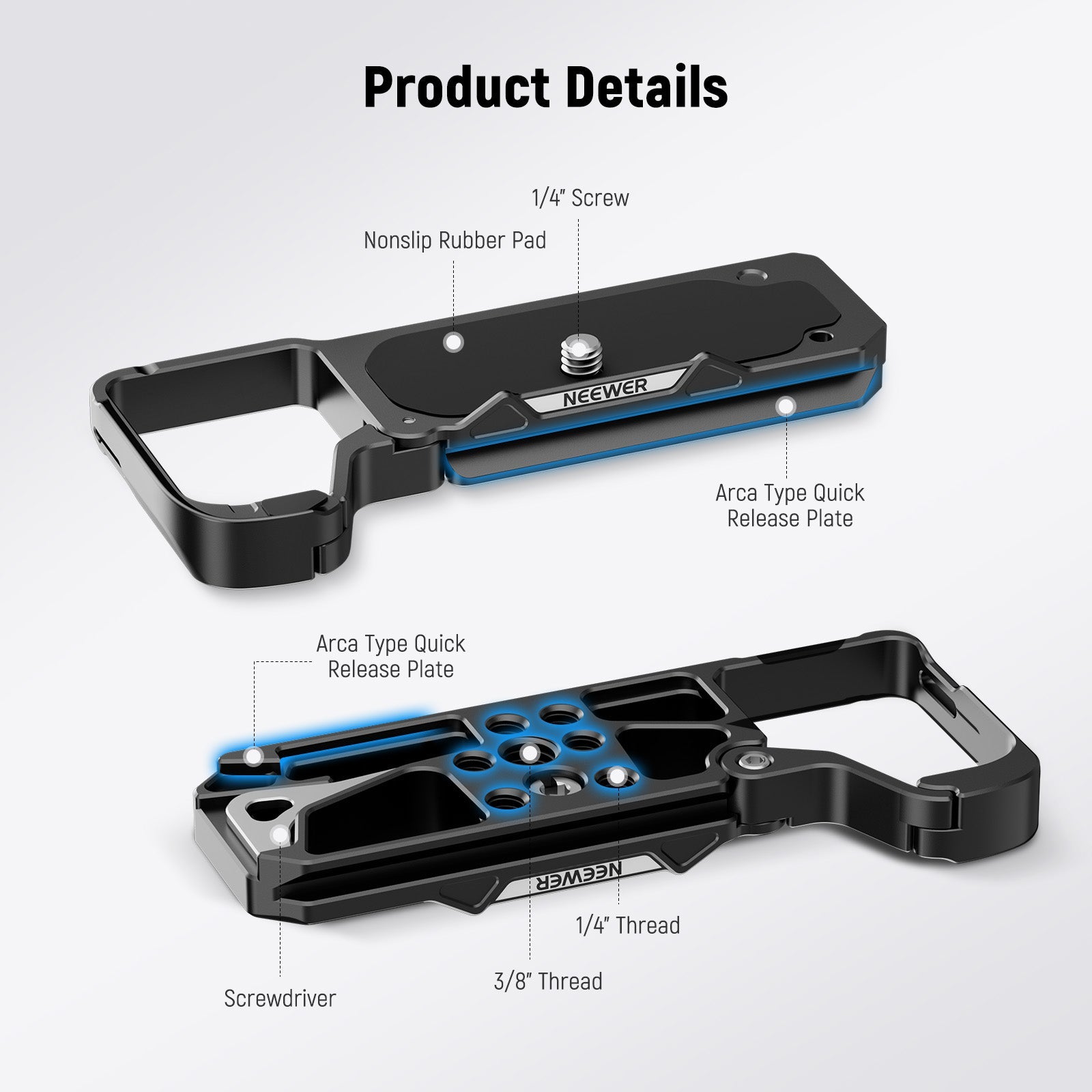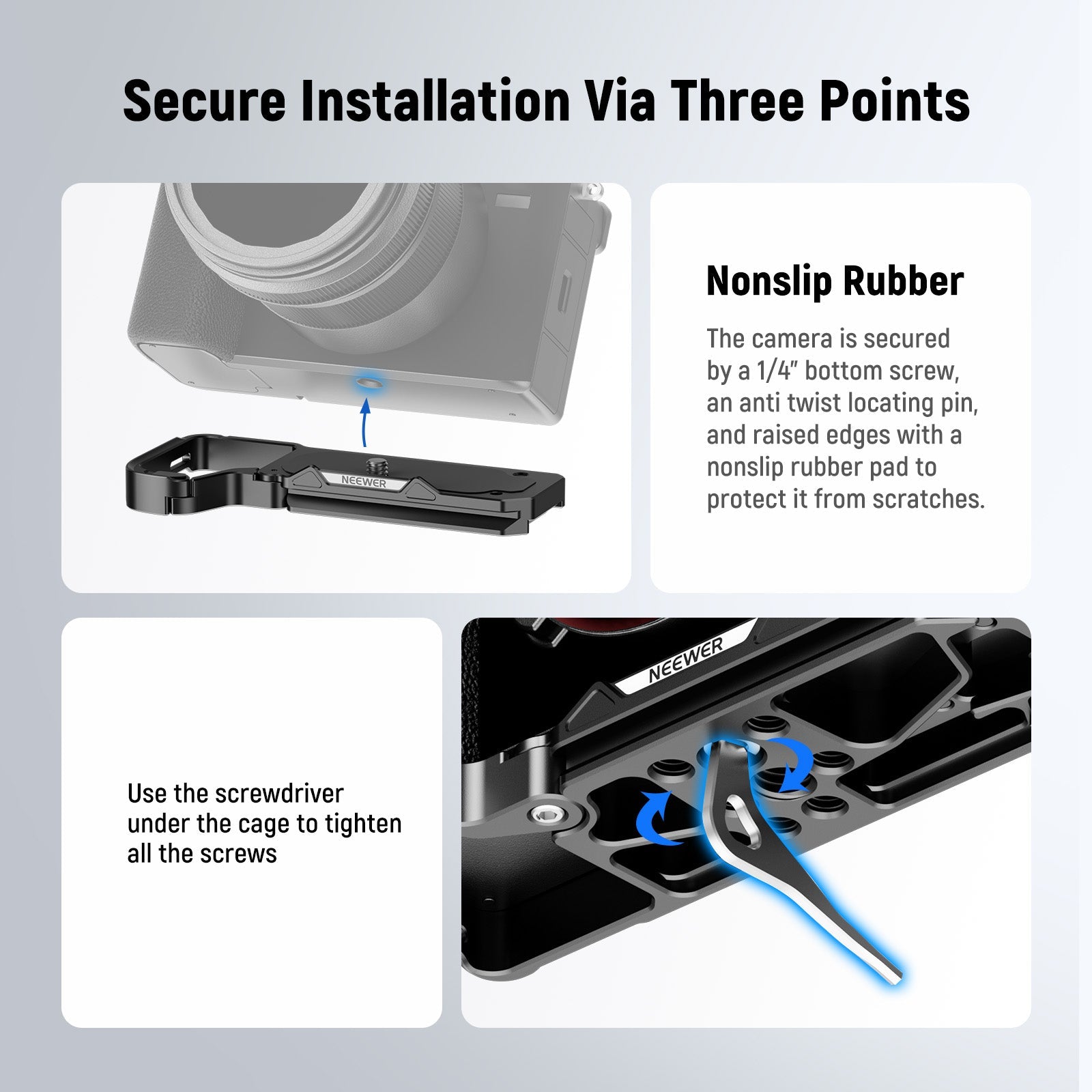 - Convenient & Secure Attachment- Securely mount your camera with the 1/4" screw and protect it from undesired scratches by the nonslip rubber pad. Use the wrench under the baseplate for screw tightening