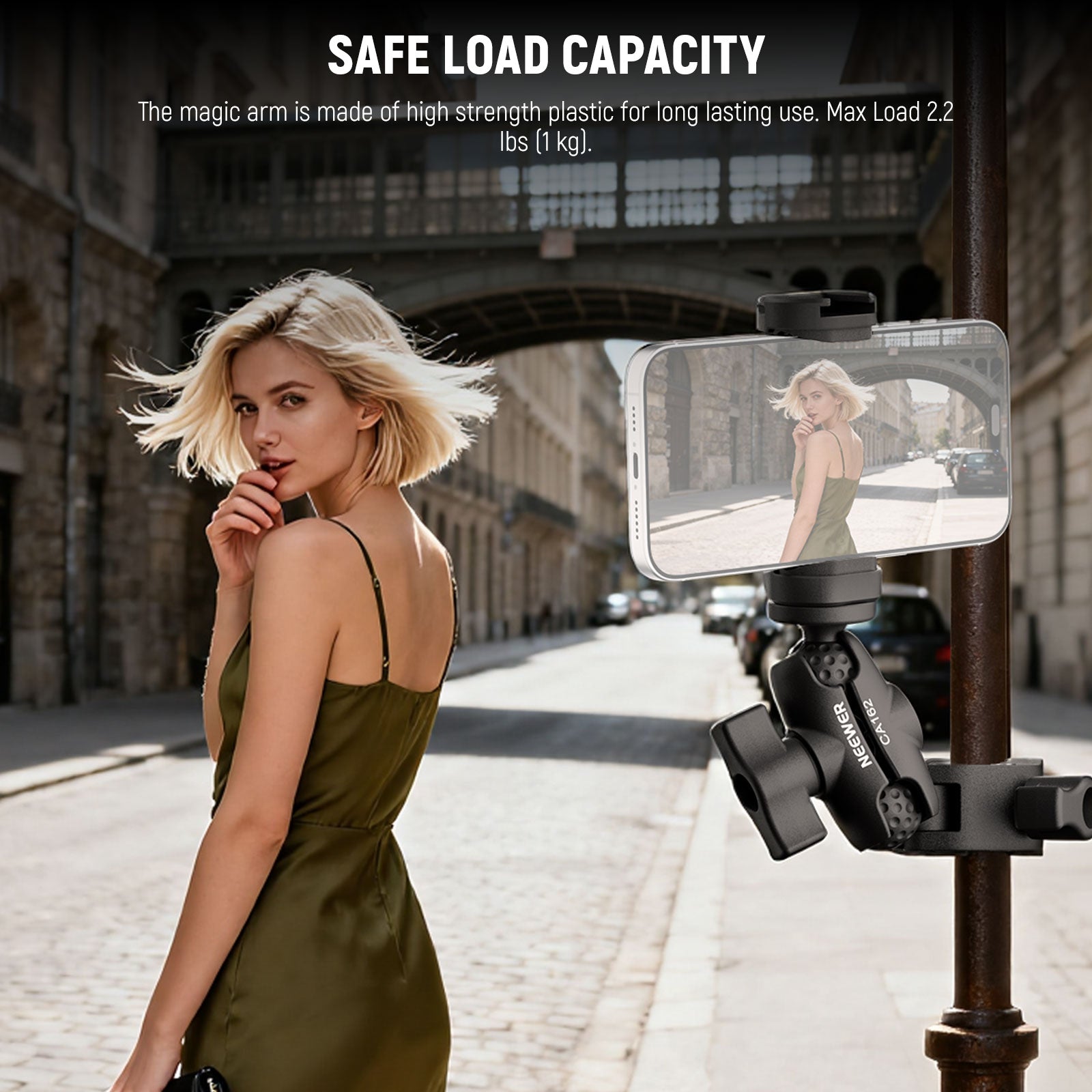 - Super Clamp Camera Mount- The magic arm features a super clamp on one end and a 1/4" screw on the other, allowing you to securely attach your devices to tubular or flat surfaces, thanks to the included action camera mount and smartphone holder. With dual 360° ball heads, it supports multiple angle adjustments, making it especially useful for quickly adding or repositioning gear during photo shoots or video recordings