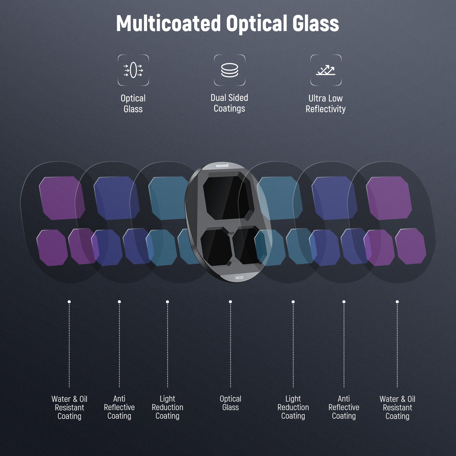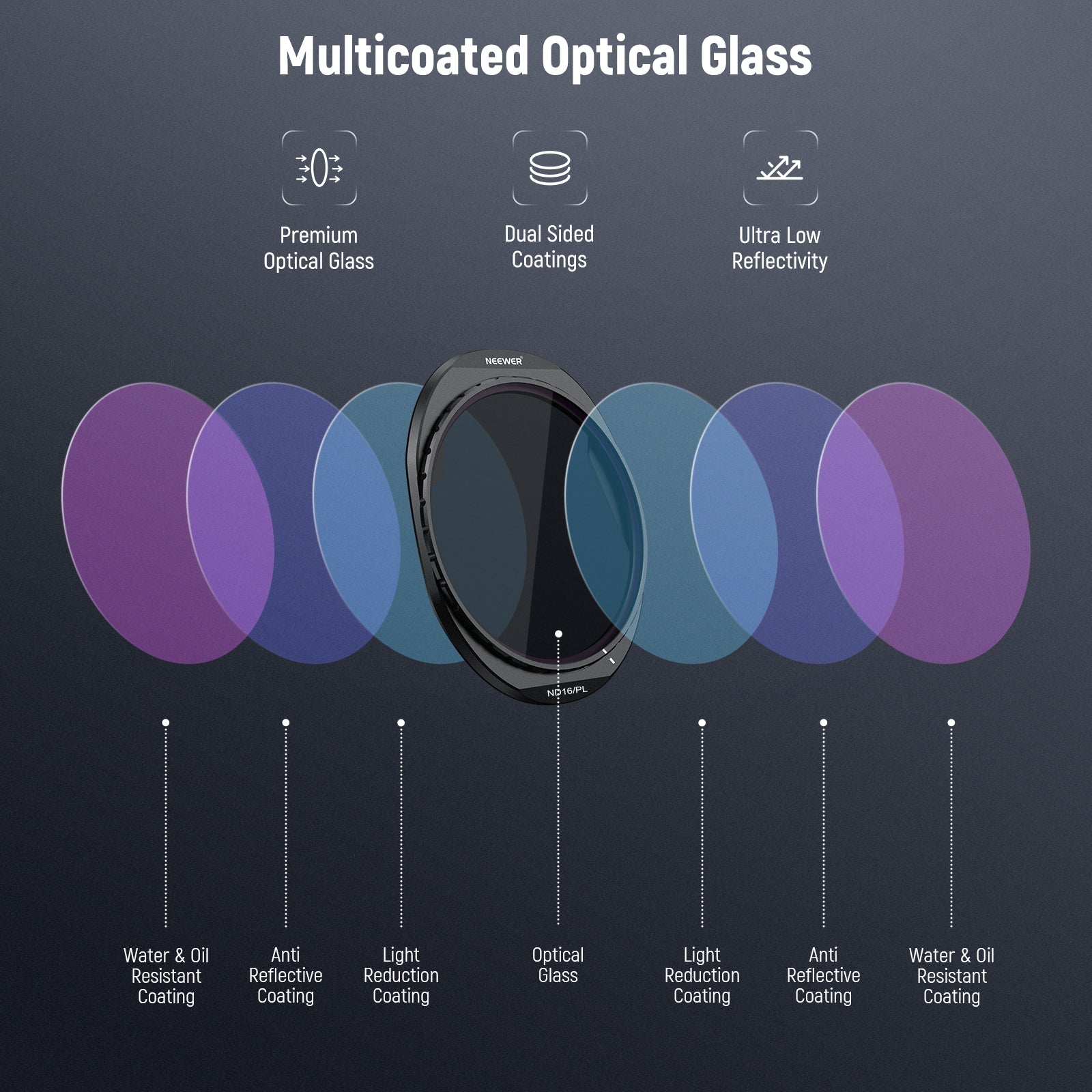 - Multicoated Optical Glass- Optical glass ensures accurate color reproduction and enhanced clarity. Multiple protective coatings resist water, dust, smudges, scratches and reduce reflections. A cleaning cloth is included to help you keep the filters spotless