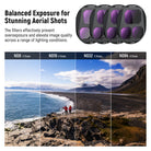 - Precise Exposure Control- The ND8, ND16, and ND32 filters reduce light by 3, 4, and 5 stops, respectively. They can effectively prevent overexposure in bright environments and add a dynamic motion blur effect to your shots