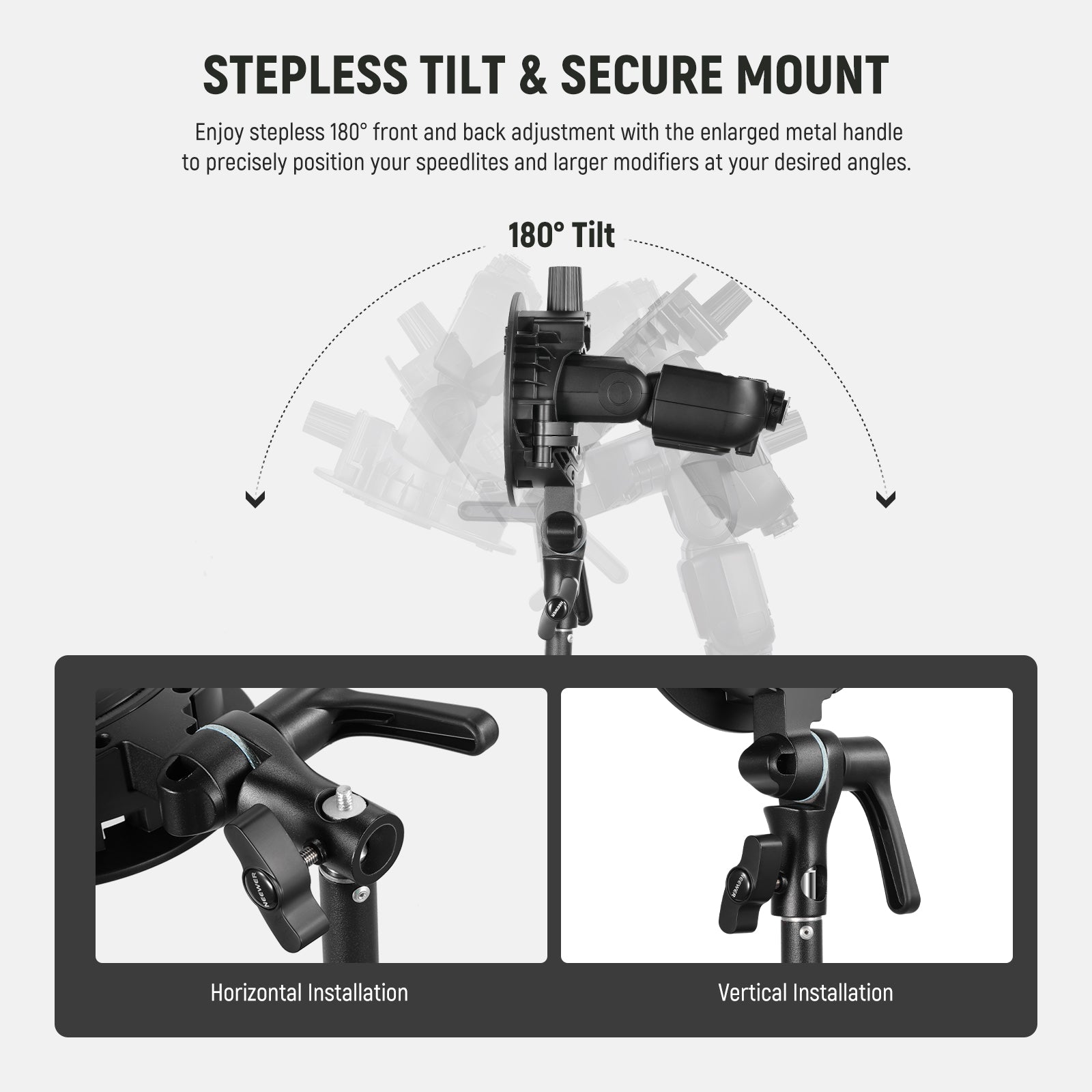 - 180° Tilting & Secure Mounting- The stand mount adapter with a large handle enables 180° precise tilting movement. It can securely attach to a light stand with the 5/8" stud or function as a handgrip for flexible handheld use