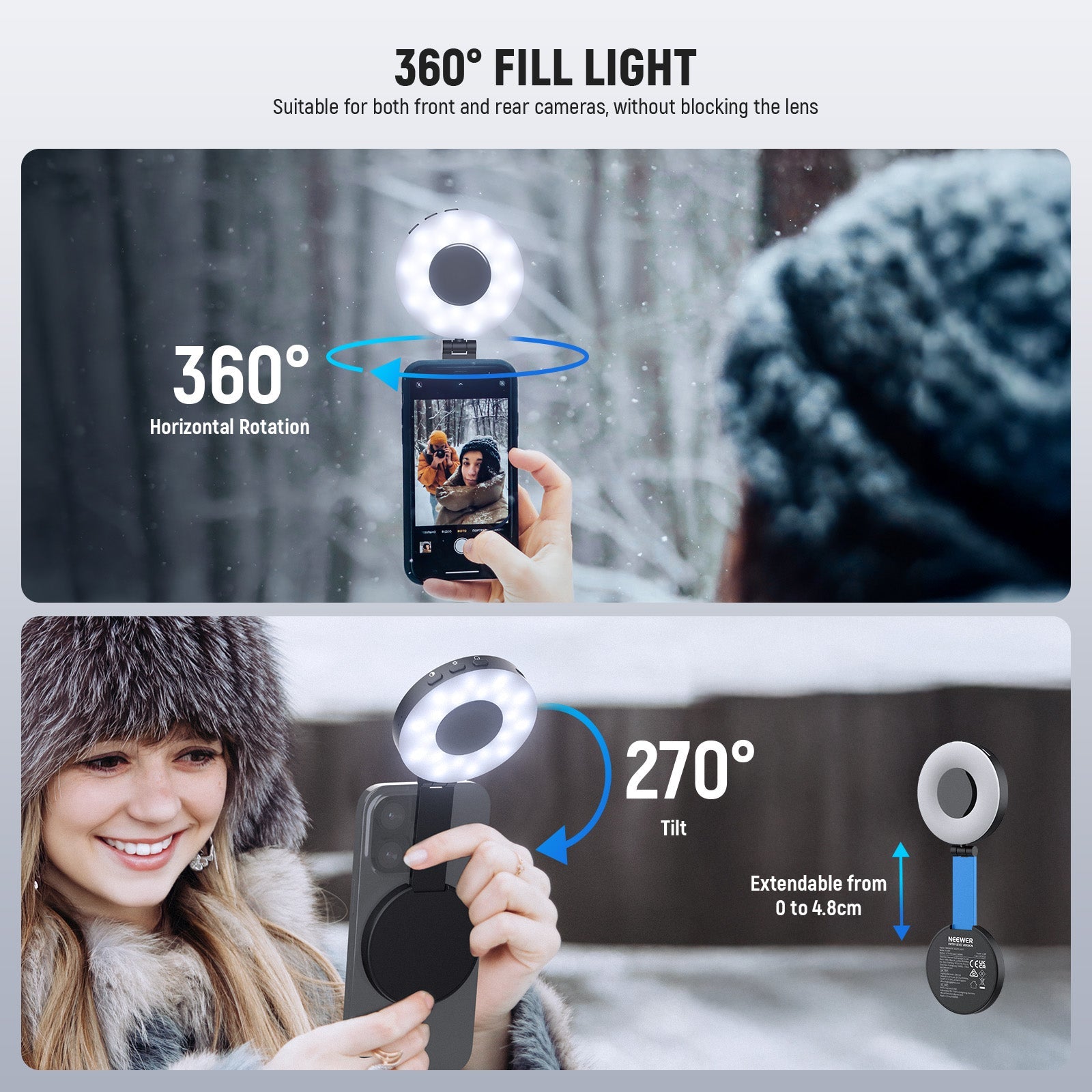 - Portable Mini Ring Light for Phone- The NL40R LED fill light for cell phone photography and video calls is compact at 2.64"x2.64"x0.89"/67x67x22.5mm when folded, weighing only 2.47oz/70g. It easily fits in a pocket, making it an ideal accessory for on the go shots. It features 40 premium warm & cool LEDs that provide 914lux/0.2 illuminance with a high CRI of 95+, ideal as phone selfie lighting to enhance your complexion and minimize facial blemishes to make you look your best on camera