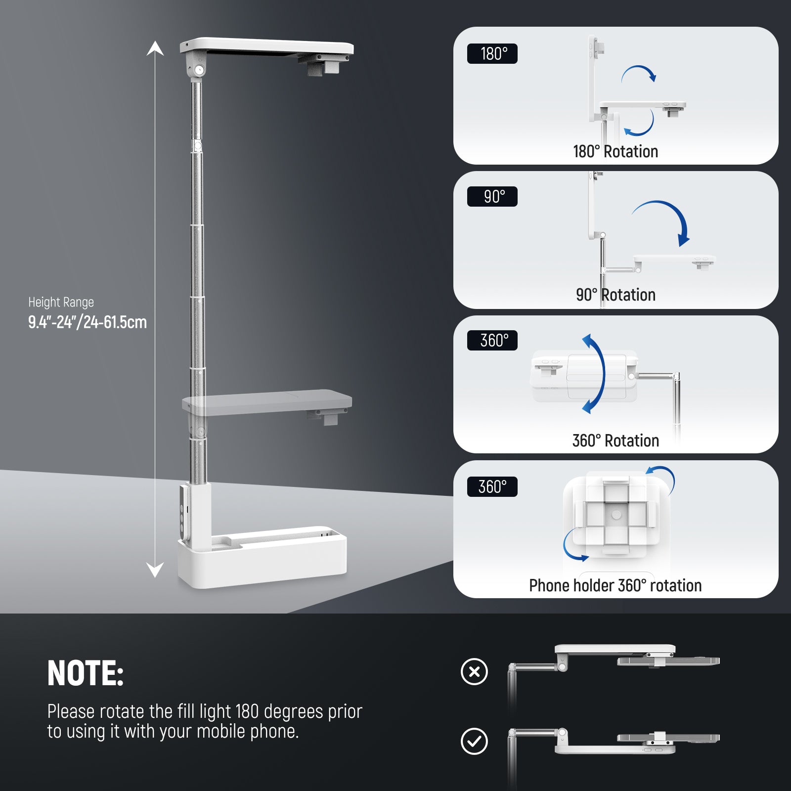 - Fully Flexible Angle Adjustments- The light head swivels 360° and tilts 180°, the light panel flips 180°, and the top extendable section folds 90°. Whether for overhead, upward, vertical, or horizontal shots, the multifunctional selfie stand with phone holder has you covered. Not just for social media content creation, it also offers soft fill lighting for makeup artist streaming, laptop/computer monitor webcam desk video conference, Zoom call, conferencing, videography podcast, virtual meeting