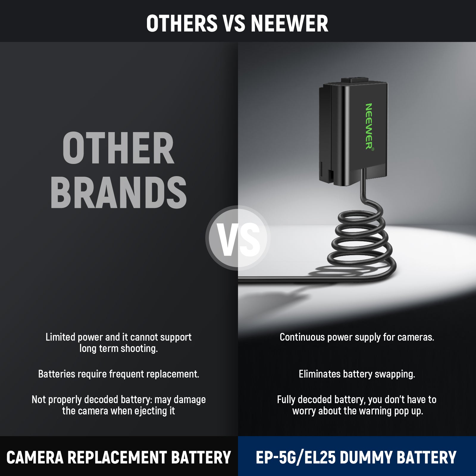 - Eliminate Battery Swapping- No more frequent battery replacement! NEEWER EP-5G replacement dummy battery kit replaces EN-EL25 Nikon batteries, ensuring continuous power supply for your camera to allow you to shoot for extended periods without interruption or the need for spare batteries