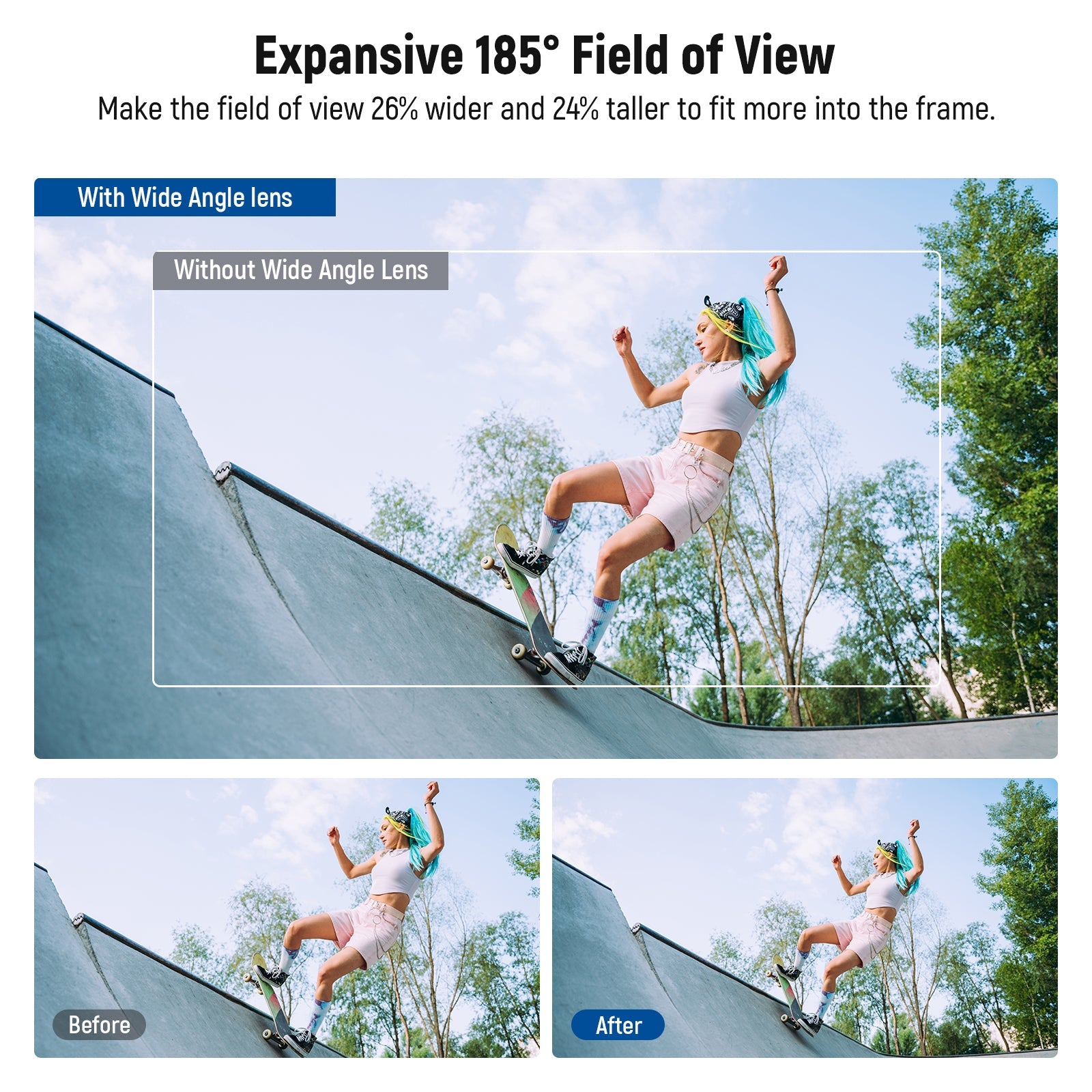 • Wide Angle Lens with 185° FOV- The wide angle lens expands the field of view (FOV) to 185° and creates a slightly distorted effect for creative shots, perfect for landscape, street photography, and group portraits. Its highly transmissive aspherical lens construction delivers exceptional clarity
