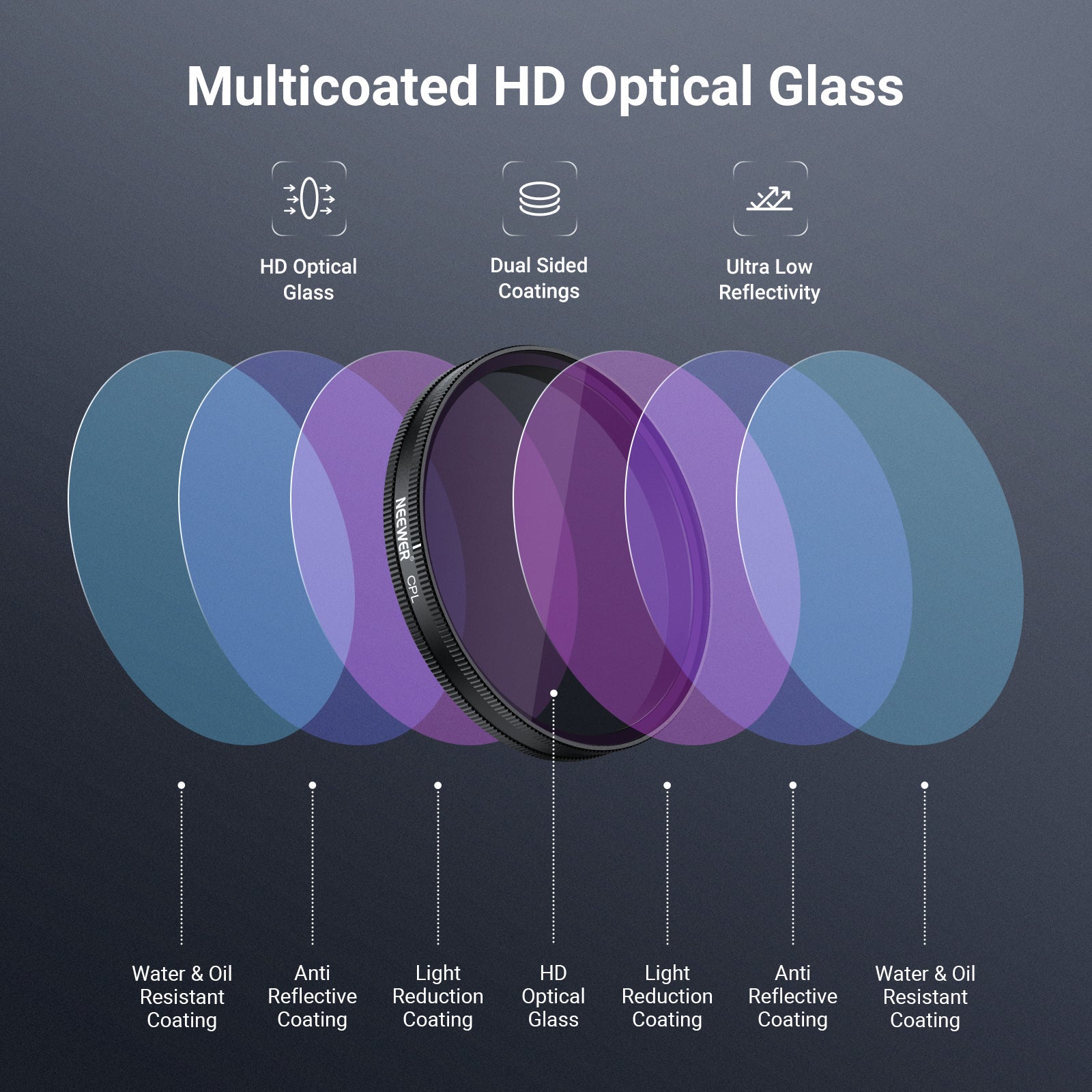 - Minimal Glare, Rich Colors- Adjustable circular polarizer filter minimizes reflection and glare on glass, water, and other nonmetallic surfaces while enhancing saturation and contrast for a vibrant color rendition