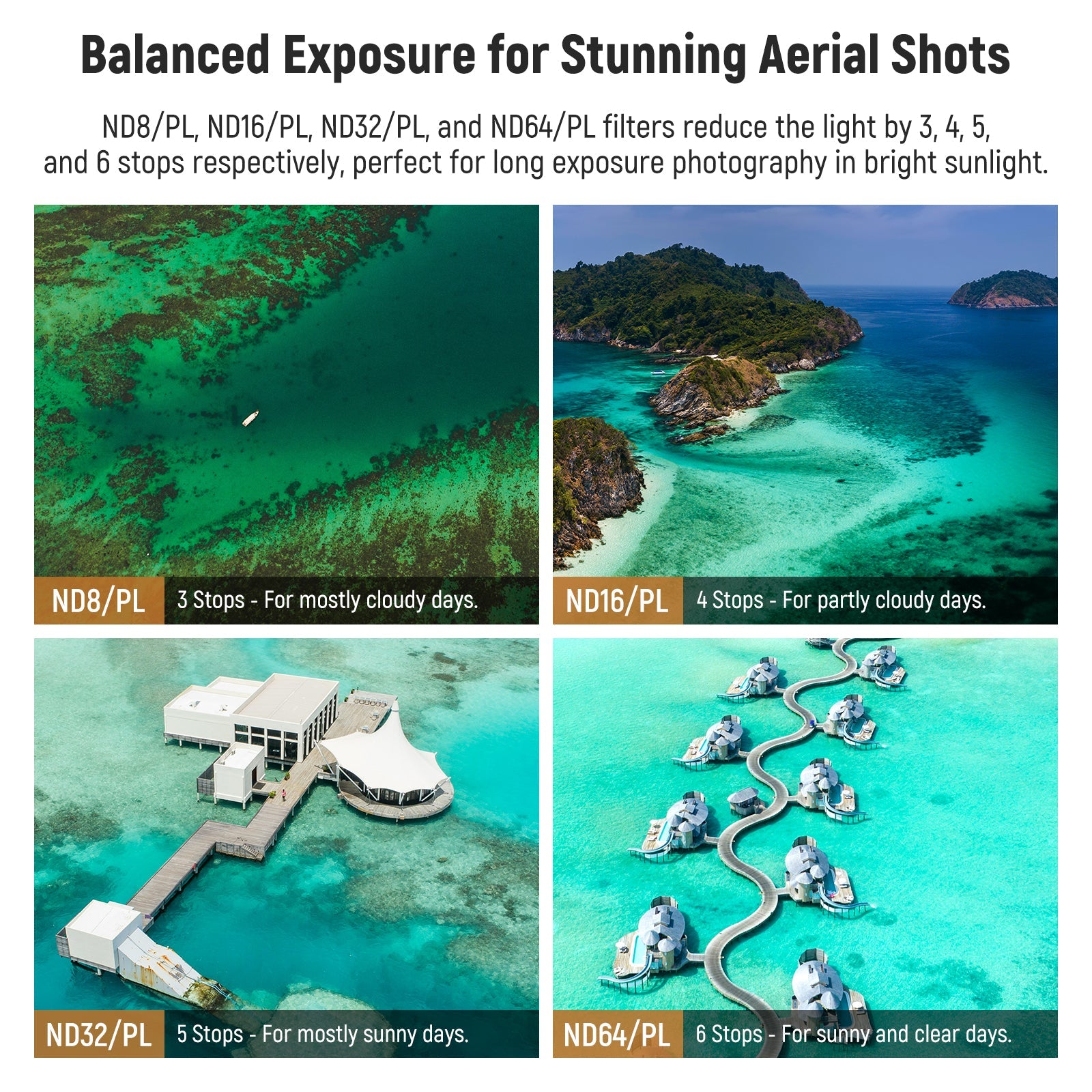 • Take Perfectly Exposed Images- ND8/PL, ND16/PL, ND32/PL, and ND64/PL filters reduce the light by 3, 4, 5, and 6 stops respectively, perfect for long exposure photography in bright sunlight. They allow you to shoot at slower shutter speeds with larger apertures and capture moving subjects with dynamic motion blur effects