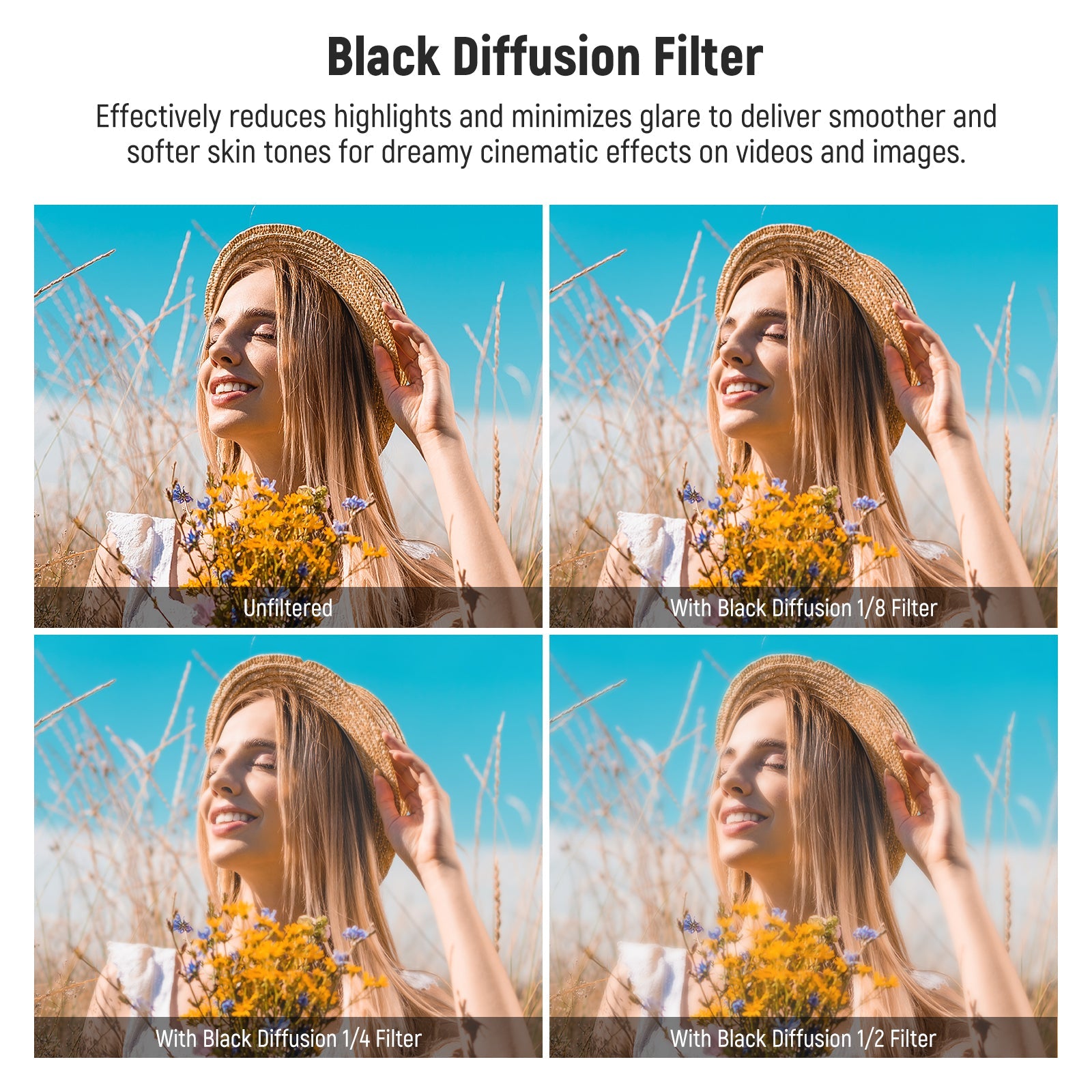 - Soft & Dreamy Cinematic Vibe- Black diffusion 1/2, 1/4, and 1/8 filters can smooth out skin texture while adding a dreamy and hazy effect to your shots, perfect for portrait photography, selfies, action packed scenes, and personal vlogs as essential and must have photography accessories for content creators/influencers' gimbal camera gears