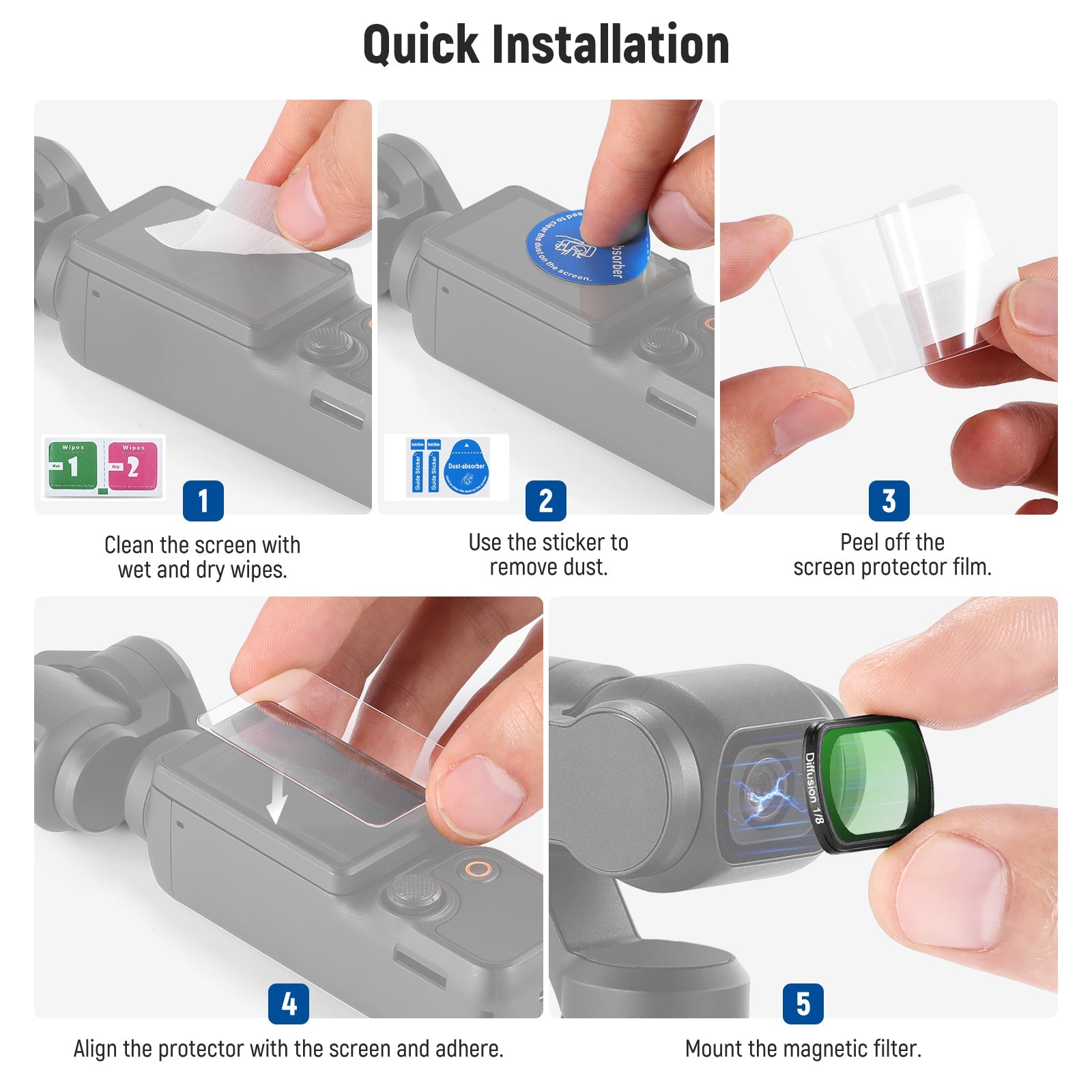 - Compatible with DJI Osmo Pocket 3- This 1/2, 1/4, and 1/8 black diffusion filter set is compatible with DJI Osmo Pocket 3. A game changer for handheld gimbal camera seasoned pros and enthusiasts, it features instant and secure magnetic attachment and HD optical glass for crystal clear imaging during vlogging and camera shooting