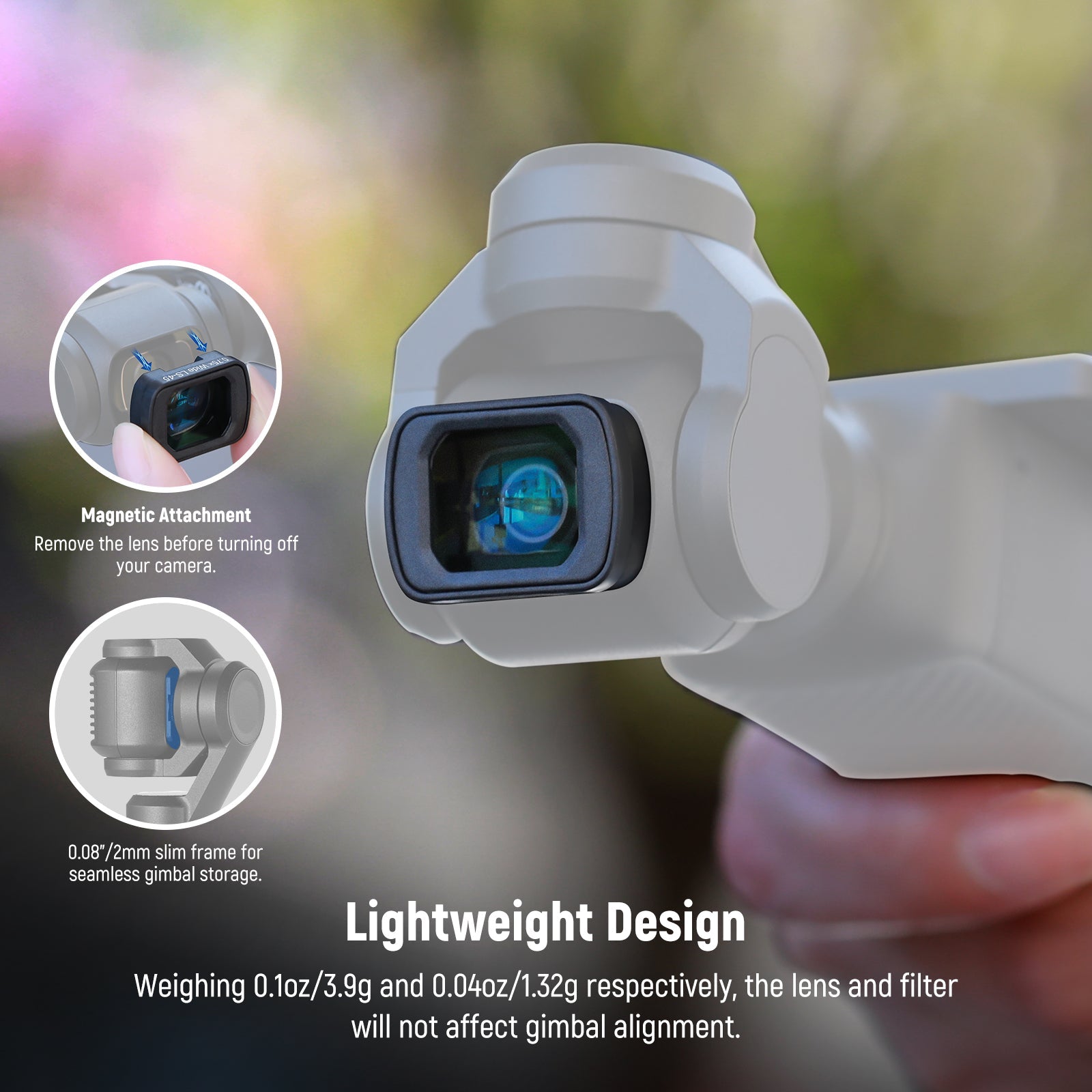 - Compatible with DJI Osmo Pocket 3- This filter and lens accessories kit is designed for Osmo Pocket 3 Gimbal Camera and its Creator Combo. It offers four neutral density filters (ND16, ND32, ND64, ND256), a circular polarizing filter, a black diffusion 1/4 filter, a 0.75X wide angle lens, and a 2X macro lens to enhance your gimbal gear's photography and action video recording as content creator essential and influencer must have
