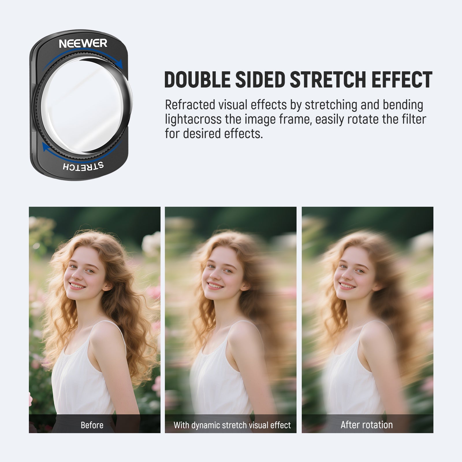 - Dynamic Stretch Visual Effect- This double-sided stretch effect filter(FL-C37) creates dynamic, distorted, and refracted visual effects by stretching and bending light across the image frame, perfect for cinematic photography and videography without the need for editing. Easily rotate the filter for desired effects
